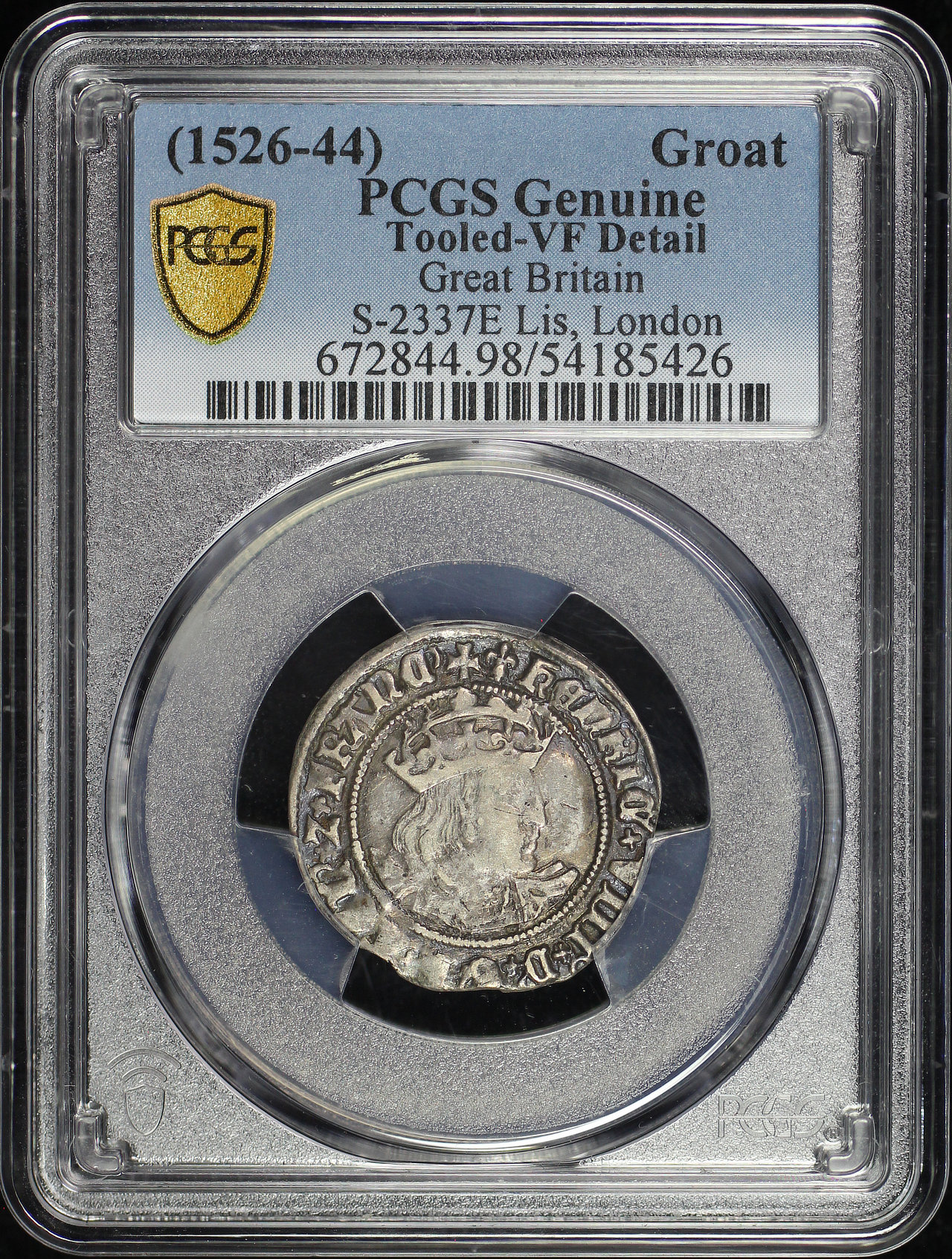 (1526-44) Great Britain Silver 1 Groat S-2337E Lis, London PCGS VF Details Tooled. This coin has the given grade as a result of it being tooled, showing alterations to the surface and recarved detail.