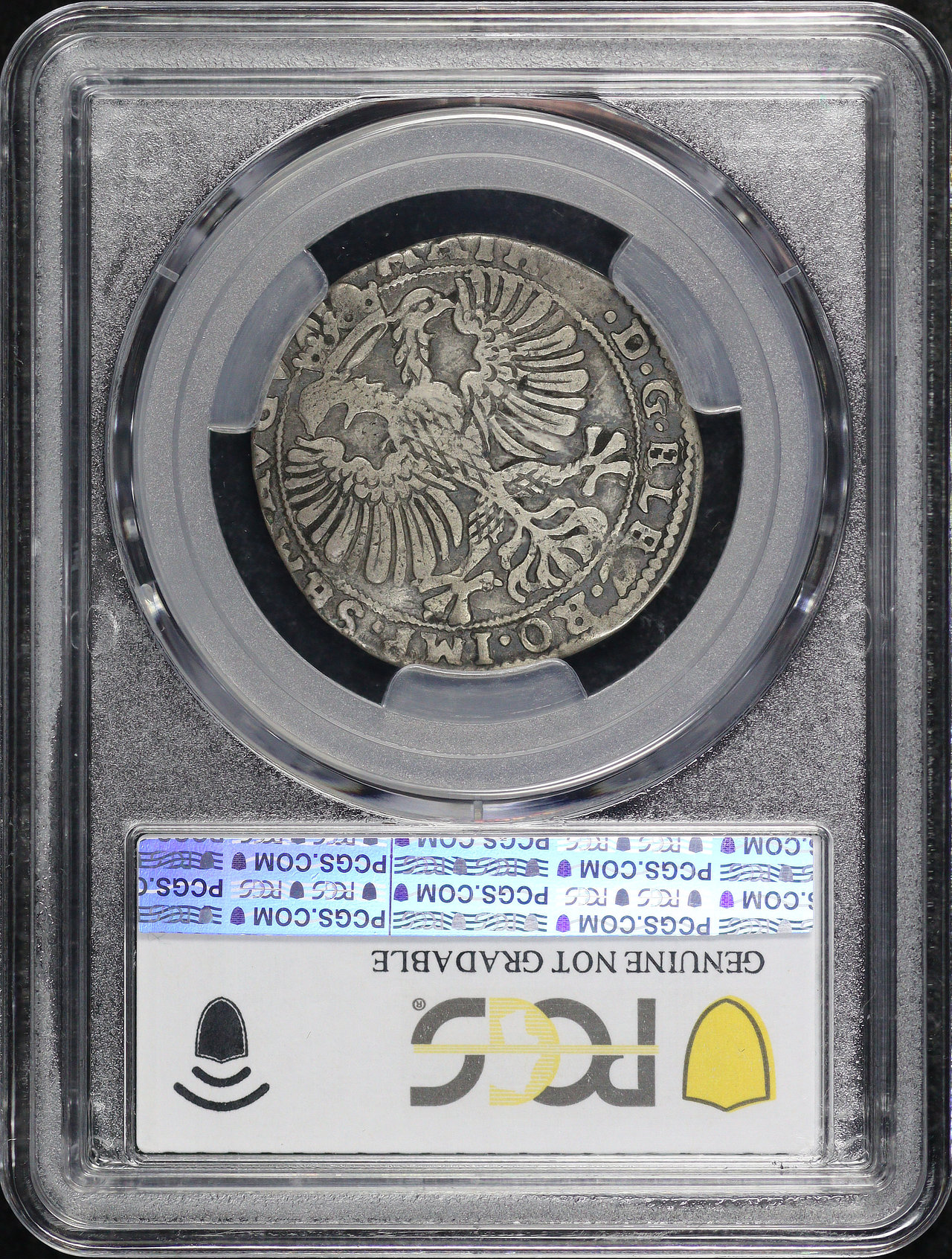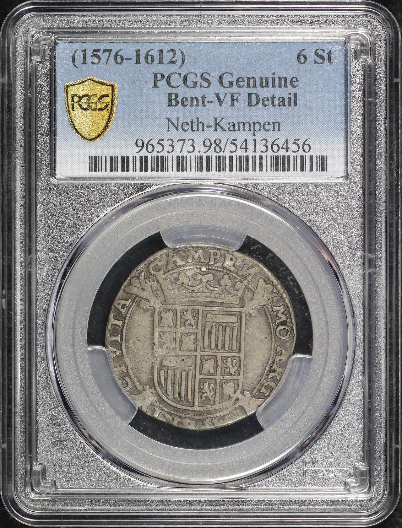 (1576-1612) Netherlands Kampen Silver 6 Stuivers KM#22 PCGS VF Details Bent. This coin has the given grade as a result of it being bent, visible going diagonally across the obverse from the top left to the bottom right.