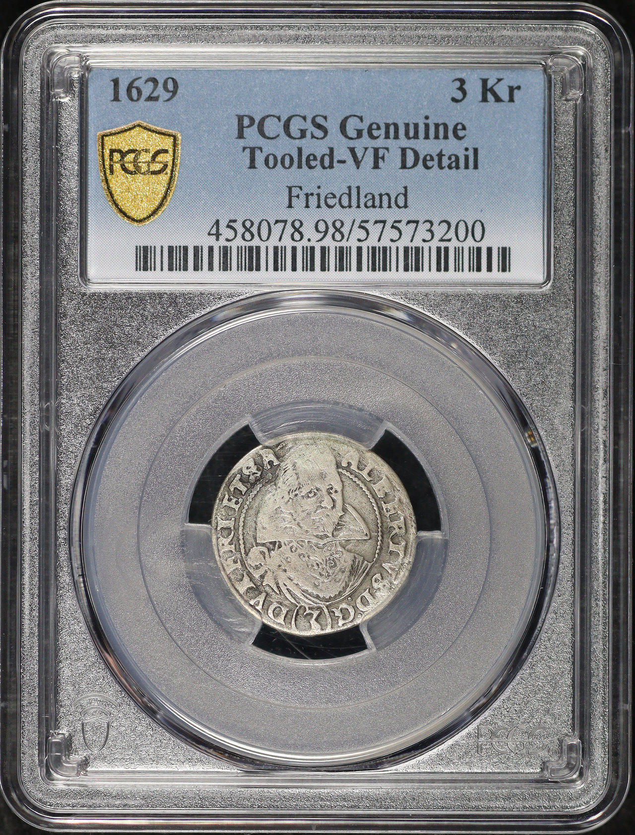 1629 Duchy of Friedland Silver 3 Kreuzer Albrecht von Wallenstein KM#50 PCGS VF Details Tooled. This coin has the given grade as a result of it being tooled, showing noticeable scratches and recarved detail.
