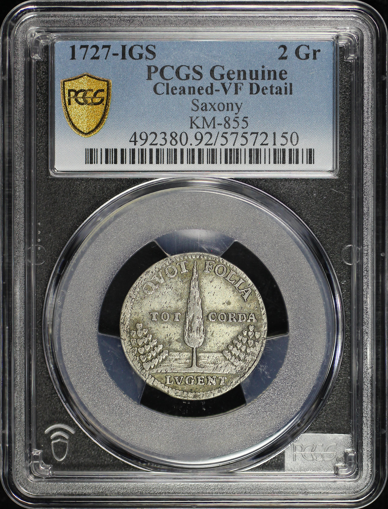 1727-IGS German States Saxony Silver 2 Groschen Frederick August I Death KM-855 PCGS VF Details Cleaned. This coin has the given grade as a result of it having been improperly cleaned, showing faint hairlines and glossy surfaces.