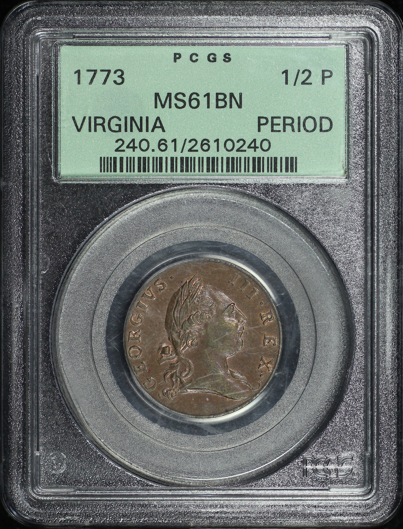 1773 Virginia 1/2 Penny Period PCGS MS-61 BN Old Green Holder.