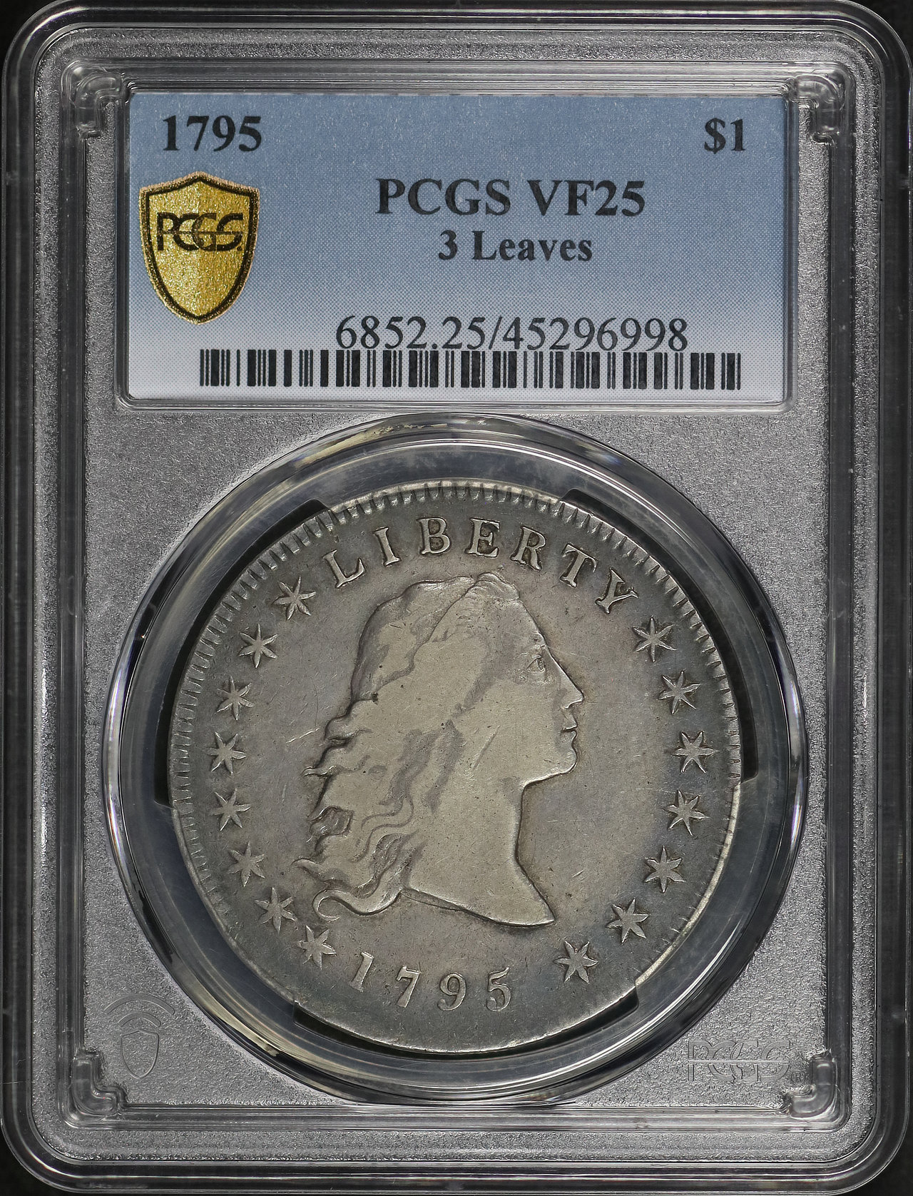 1795 Flowing Hair Dollar Flowing Hair, 3 Leaves PCGS VF-25 designed by Robert Scot.