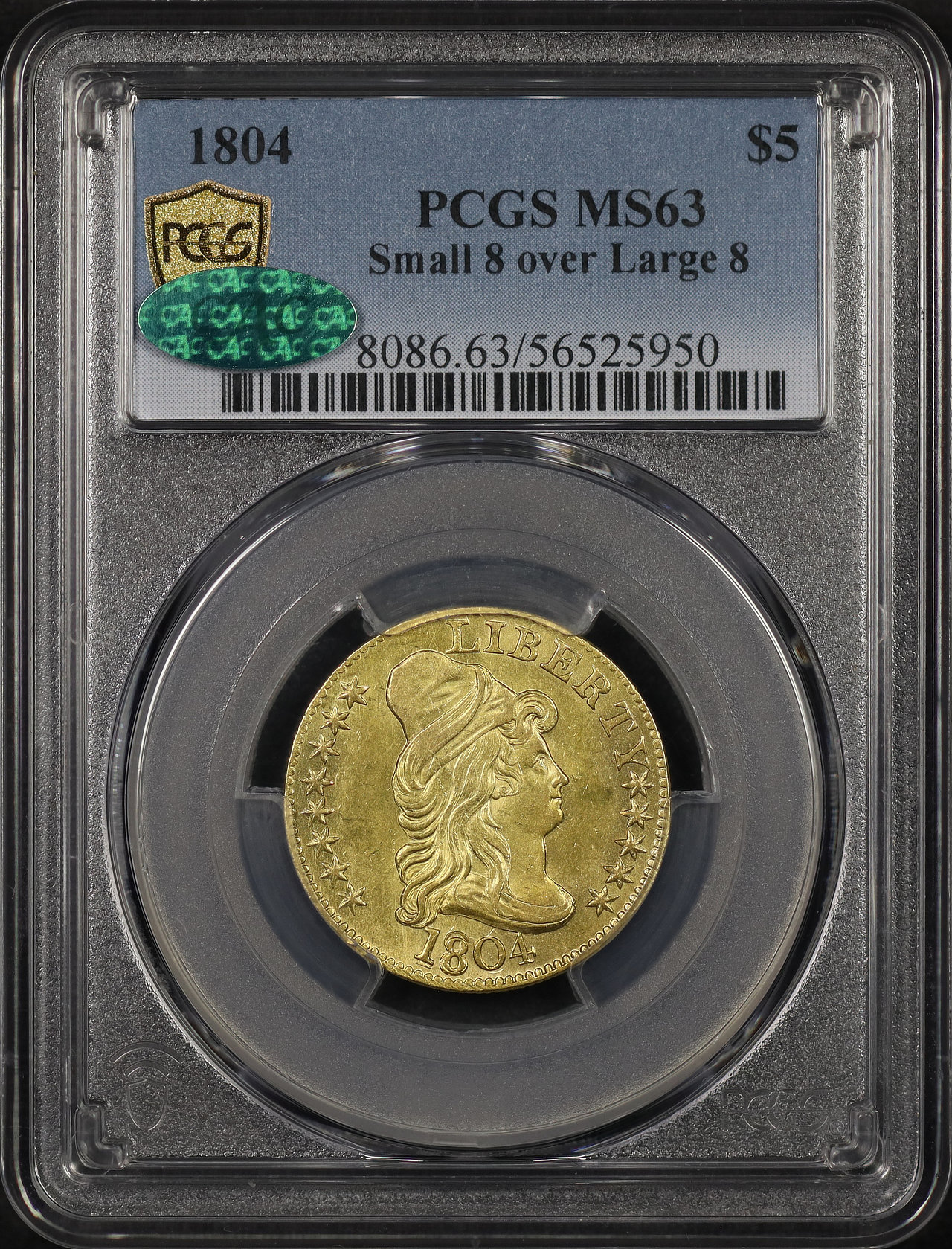 1804 Draped Bust $5 Small 8 over Large PCGS MS-63 CAC designed by Robert Scot.