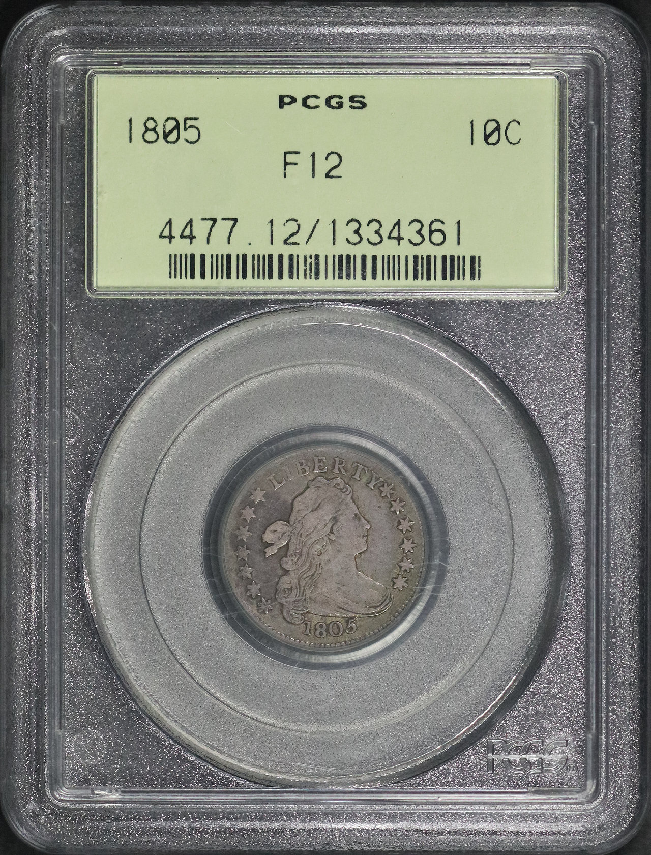 1805 Draped Bust Dime PCGS F-12 Old Green Holder designed by Robert Scot.