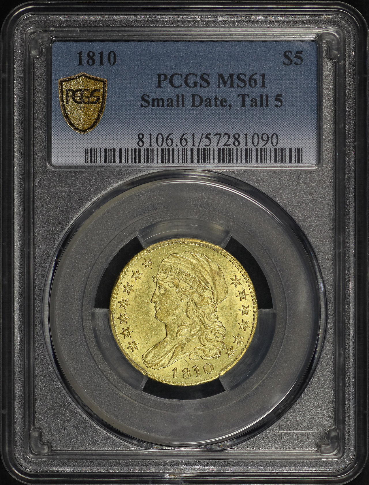 1810 Capped Bust $5 Small Date, Tall 5 PCGS MS-61 designed by John Reich.