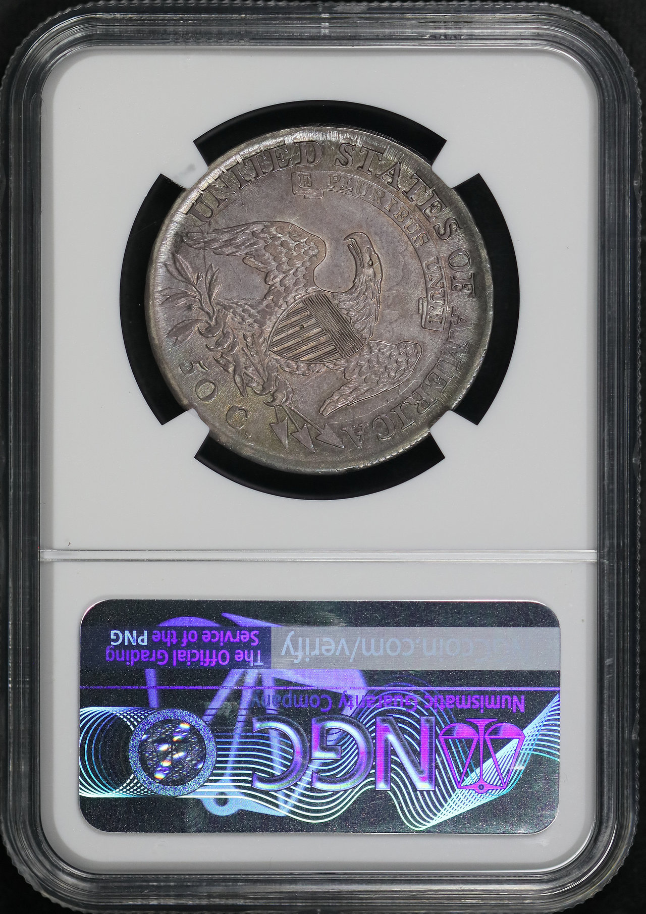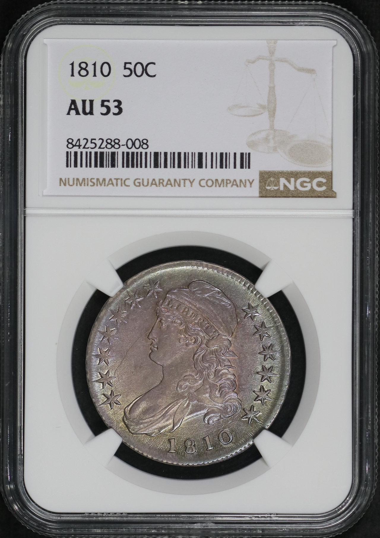 1810 Capped Bust Half Dollar NGC AU-53. Both sides display nice blue and violet hue toning!