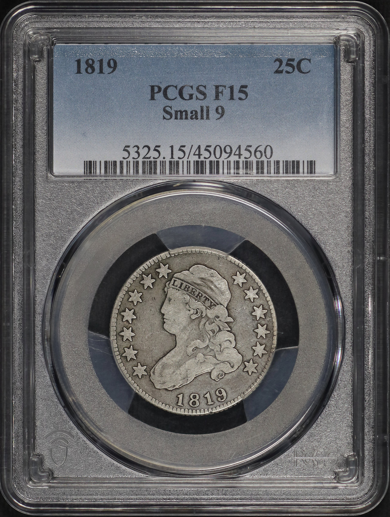 1819 Capped Bust Quarter Small 9 PCGS F-15 designed by John Reich.