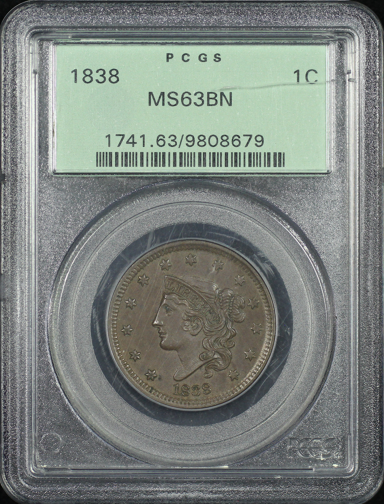 1838 Coronet Head Cent PCGS MS-63 BN Old Green Holder