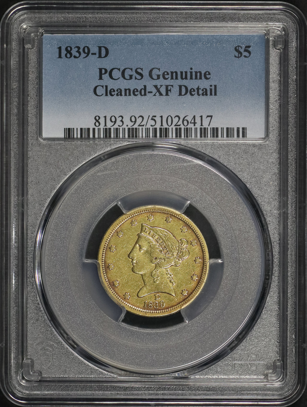 1839-D Liberty Head $5 PCGS XF Details Cleaned designed by Christian Gobrecht.