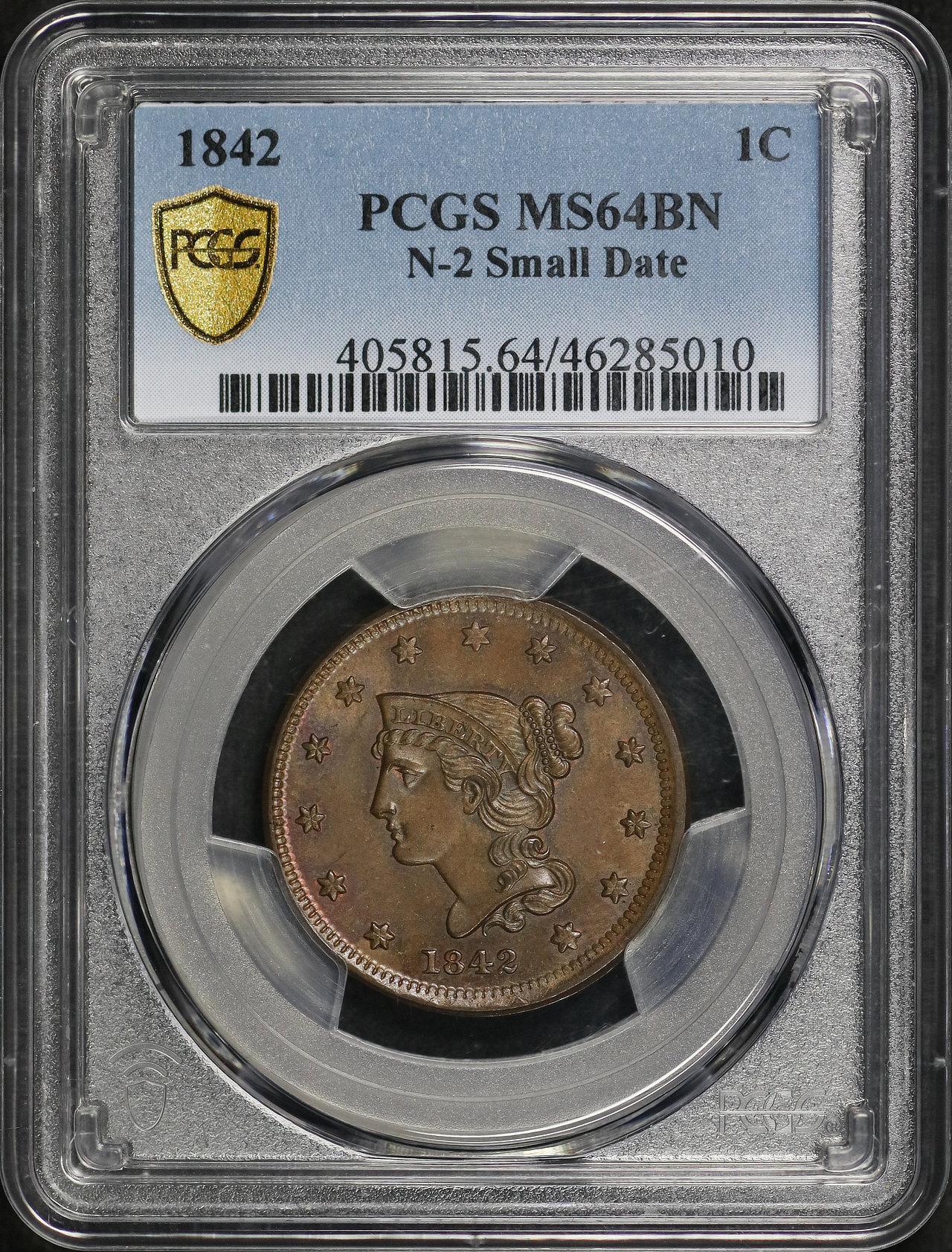 1842 Braided Hair Cent N-2 Small Date PCGS MS-64 BN