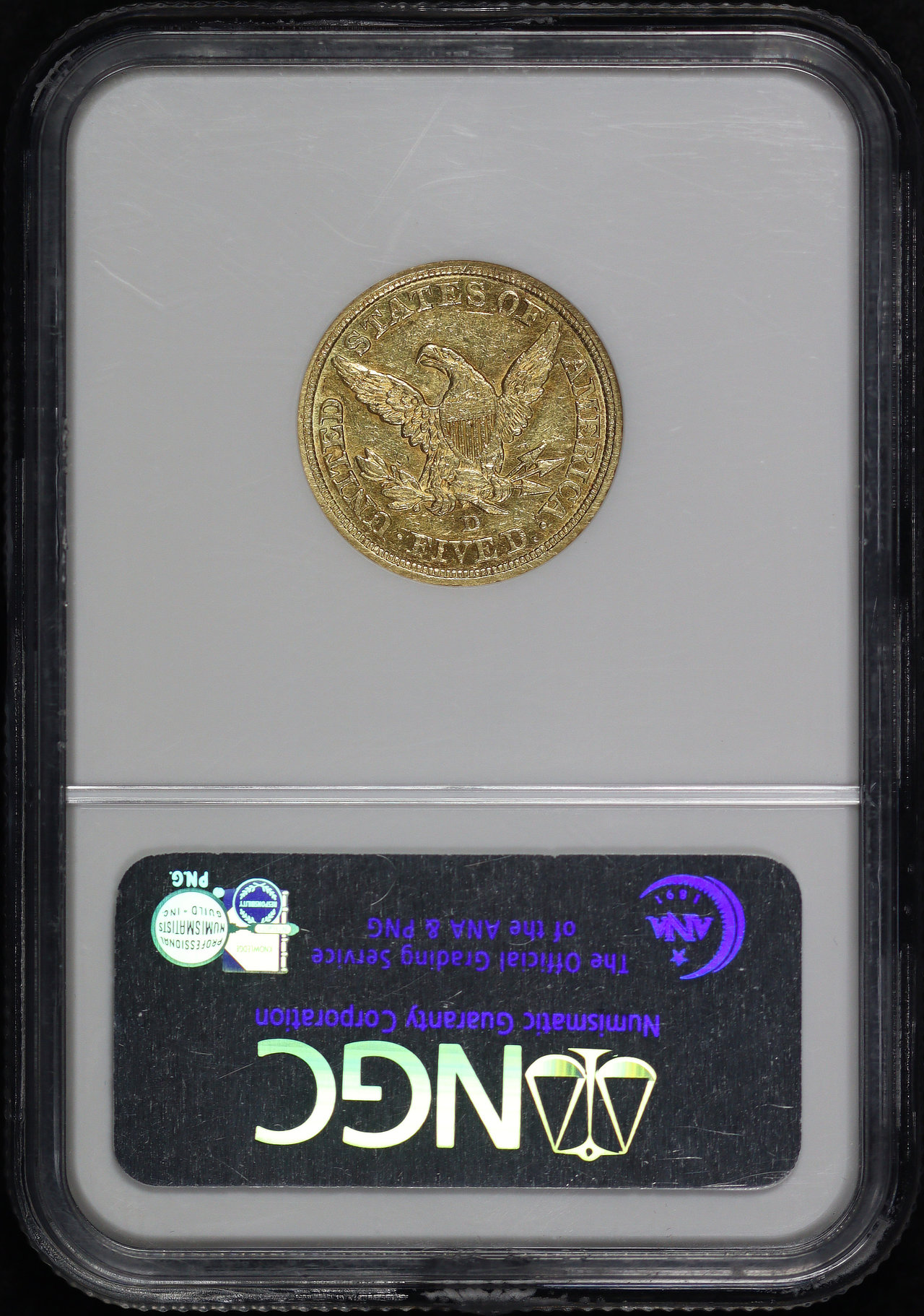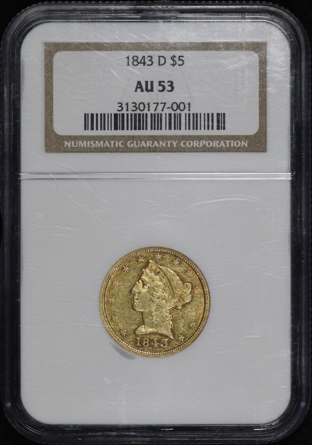 1843-D Liberty Head $5 NGC AU-53. There are some minor scuffs and scratches on the NGC holder.