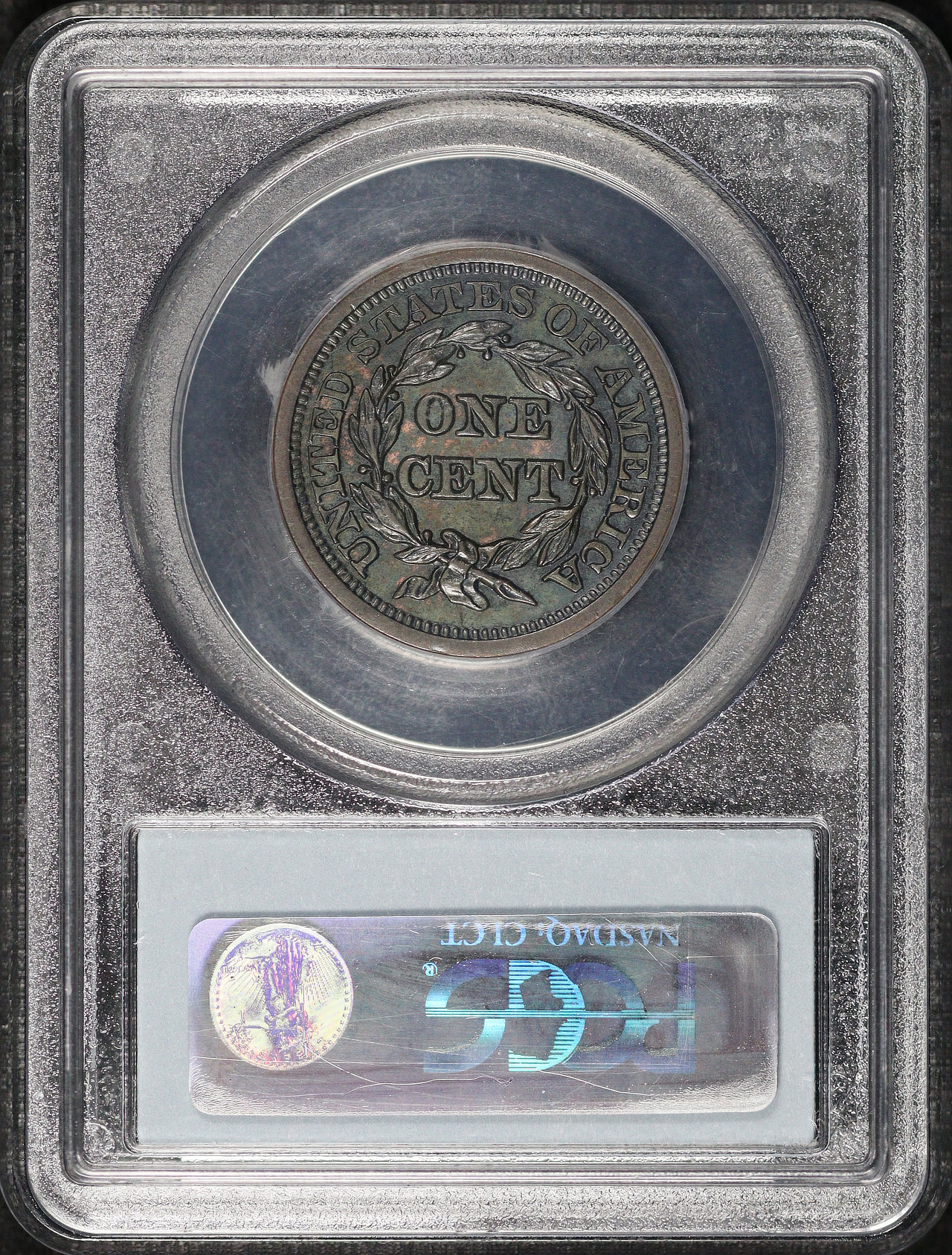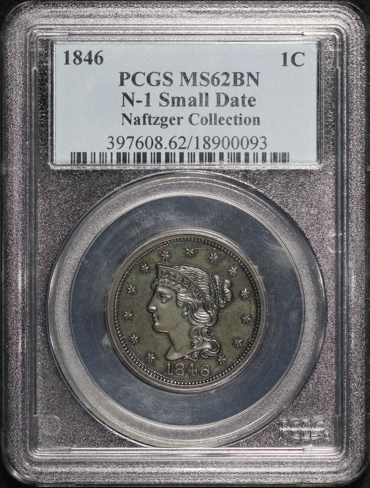 1846 Small Date Braided Hair Cent N-1 PCGS MS-62 BN Naftzger Collection designed by Christian Gobrecht.