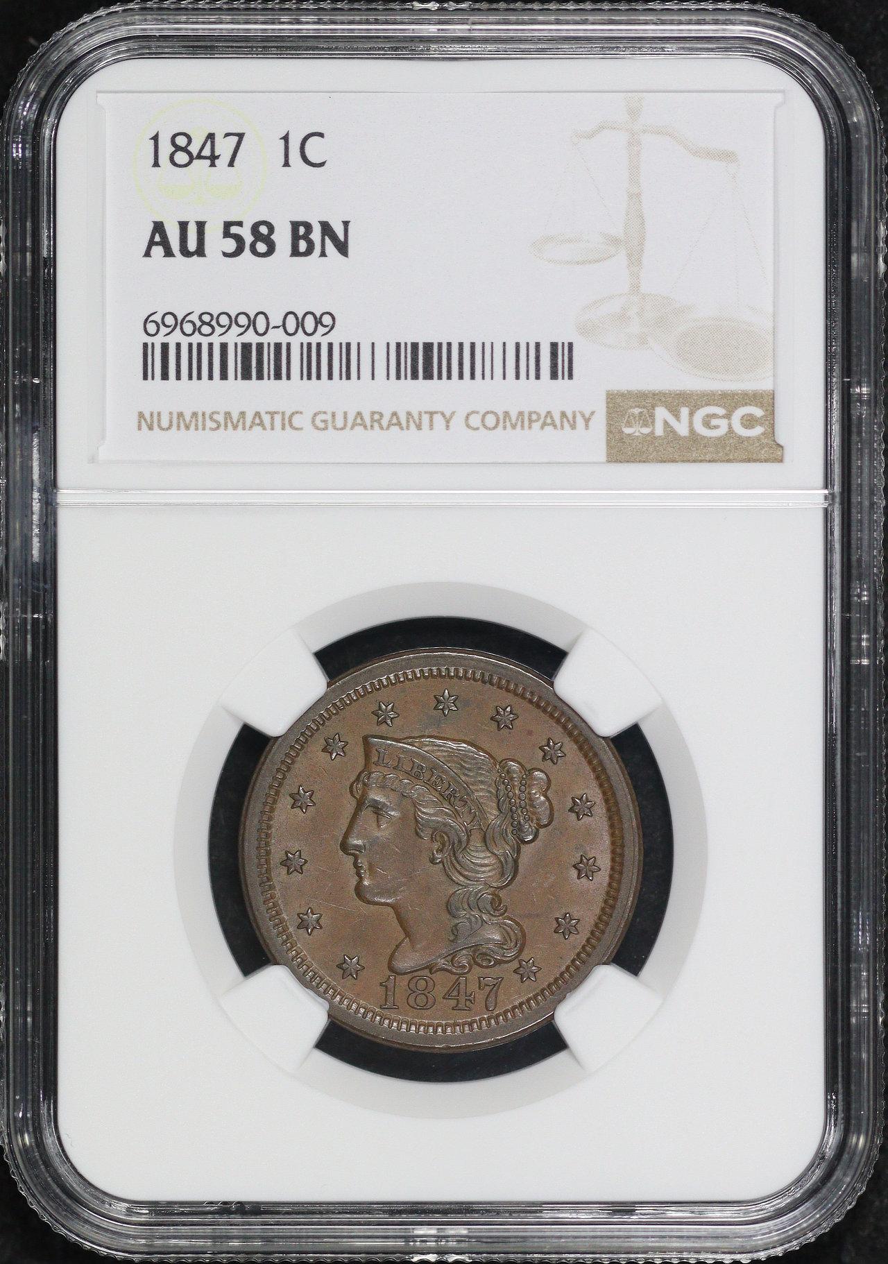 1847 Braided Hair Cent NGC AU-58 BN.