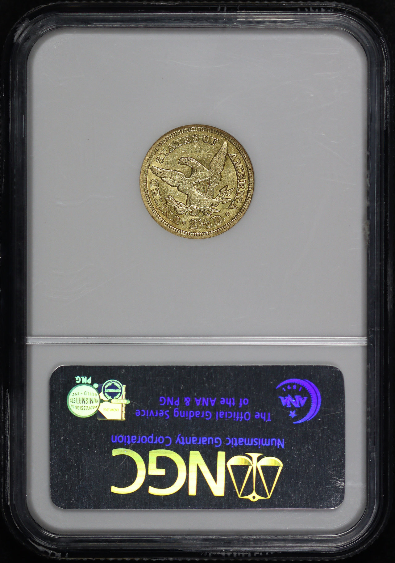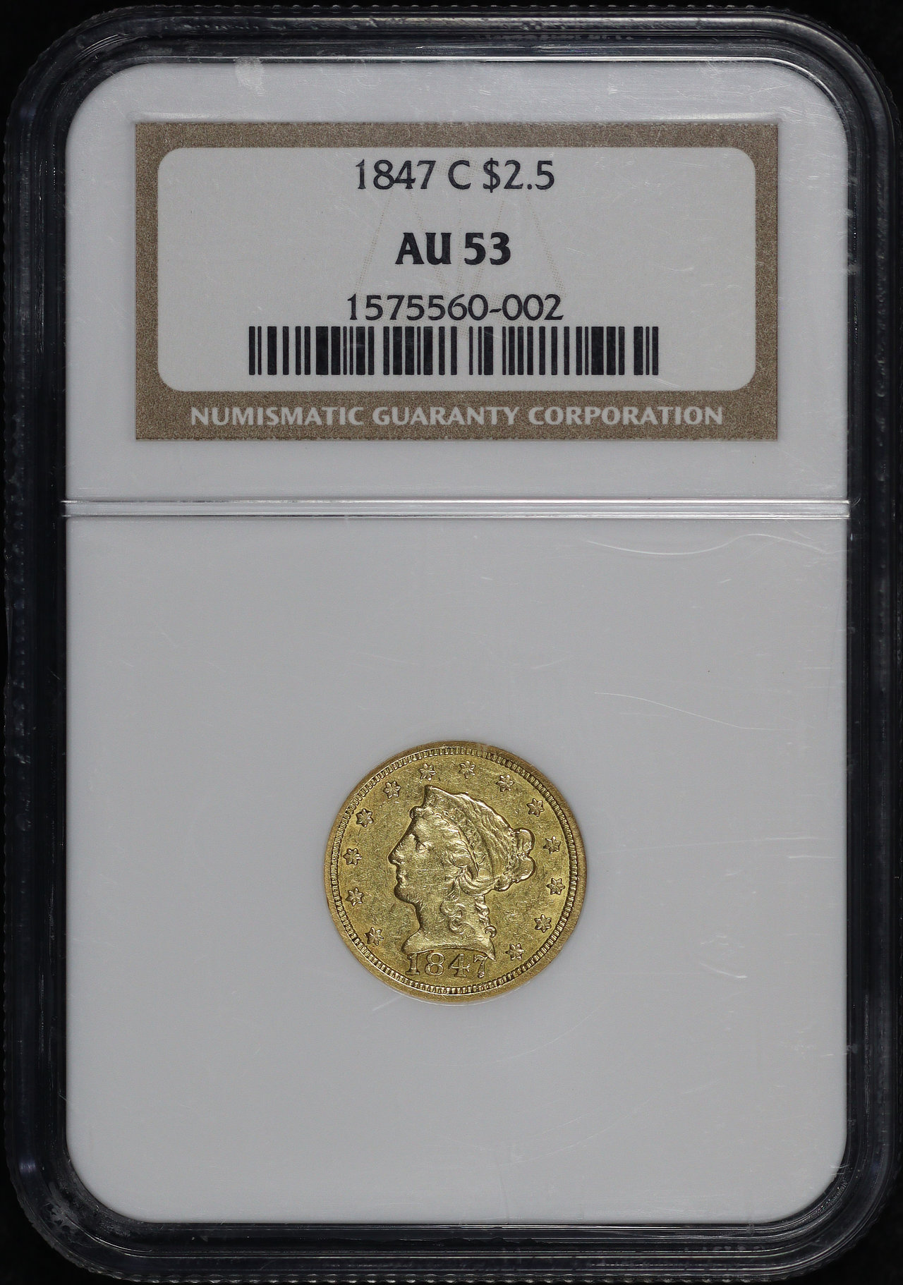 1847-C Liberty Head $2.5 NGC AU-53. There are some minor scuffs and scratches on the NGC holder.