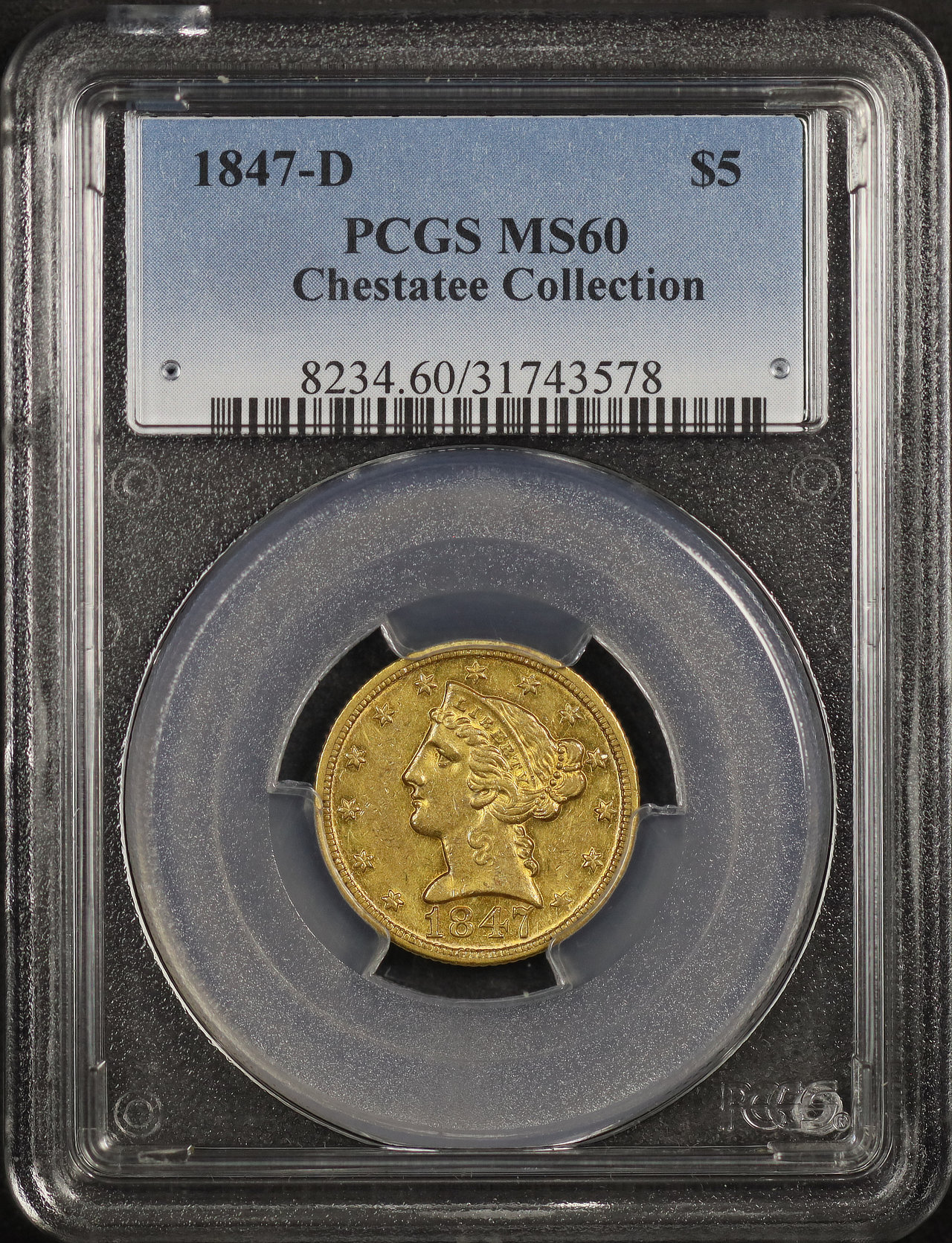 1847-D Liberty Head $5 PCGS MS-60 designed by Christian Gobrecht.