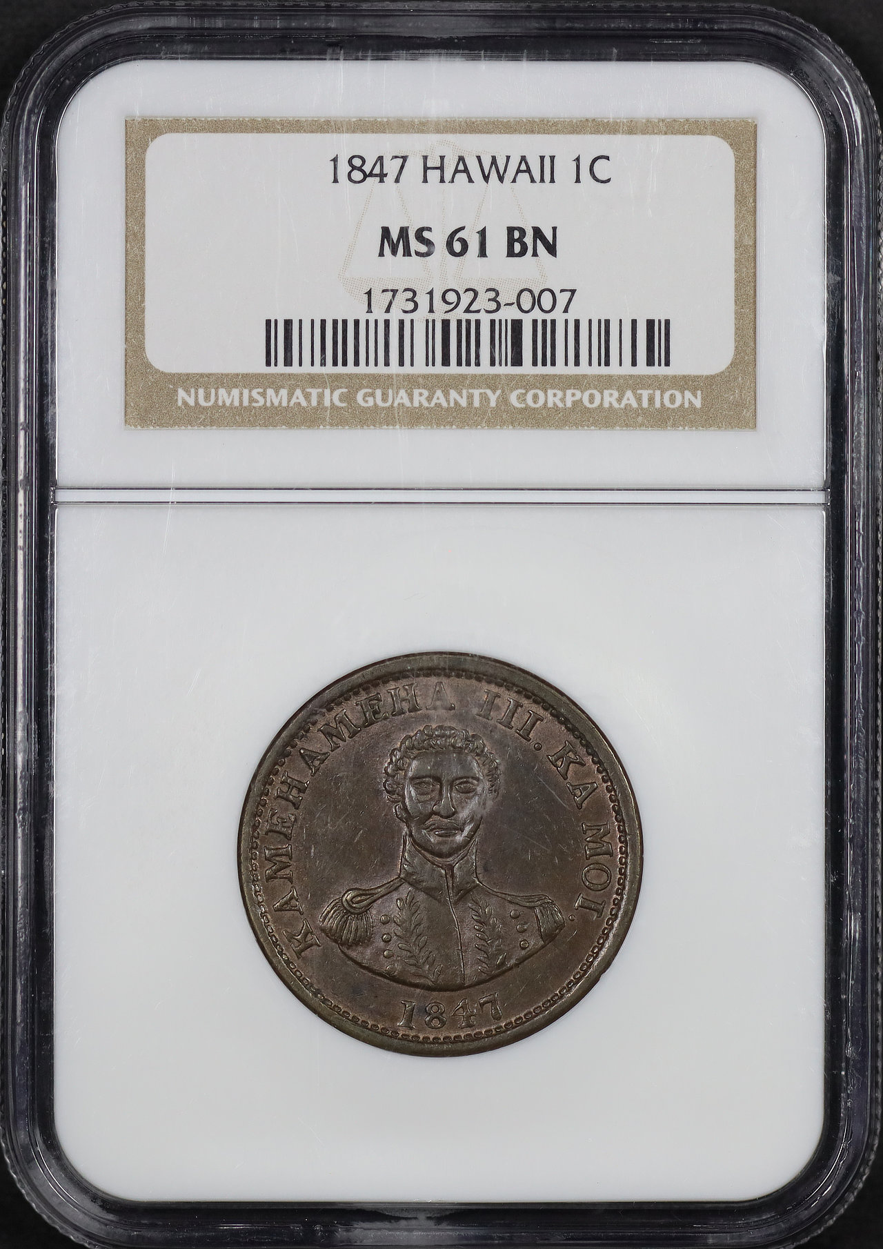 1847 Hawaii Cent NGC MS-61 BN.