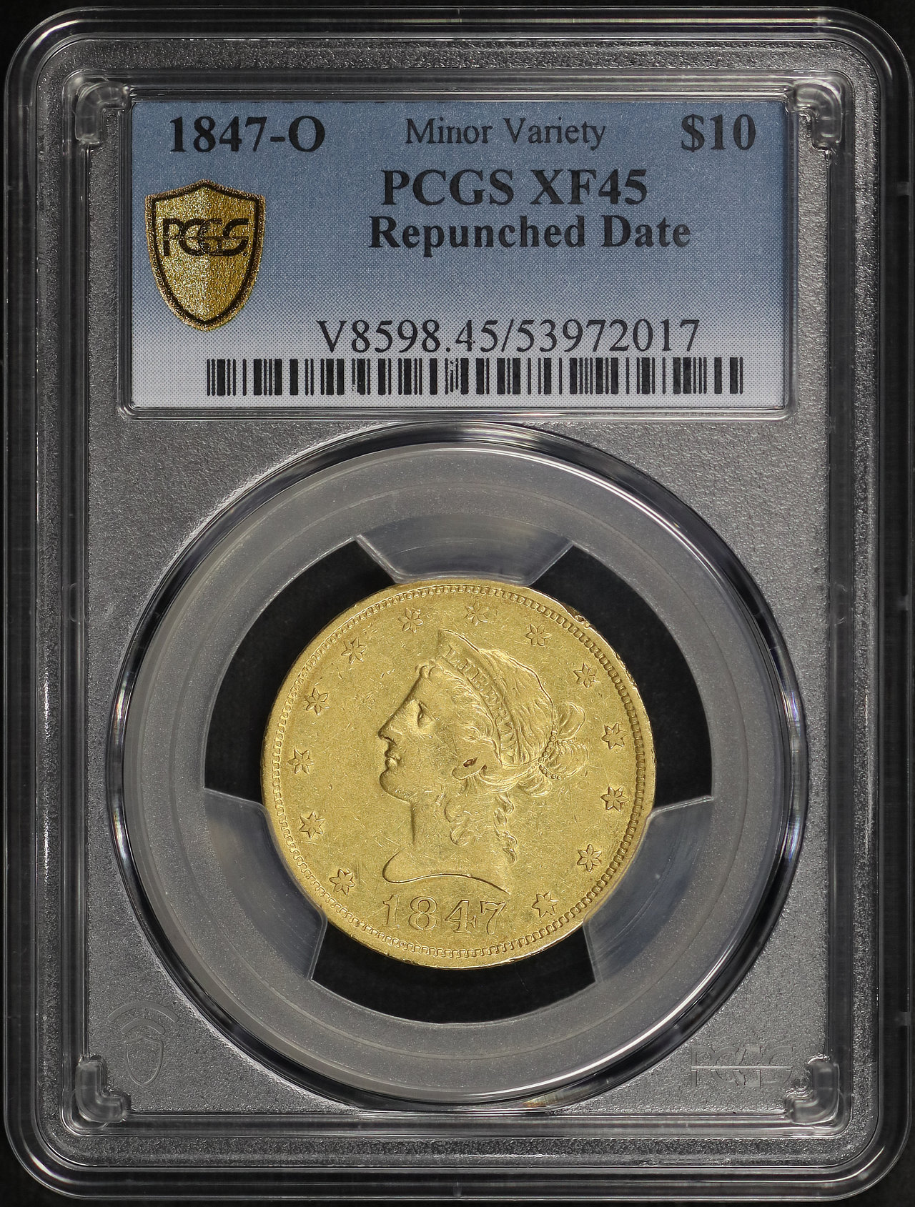 1847-O Liberty Head $10 Repunched Date PCGS XF-45 designed by Christian Gobrecht.