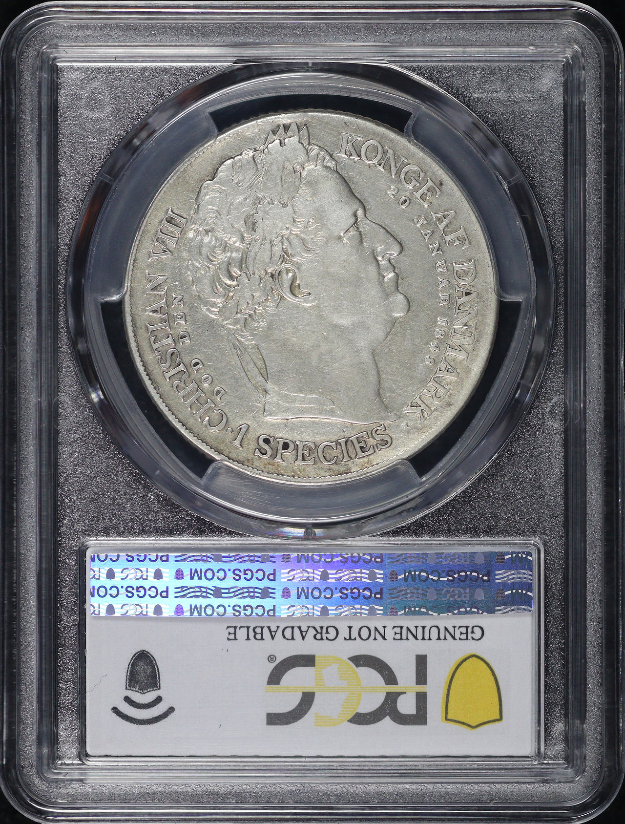 1848 FK VS Denmark Silver Death & Accession Speciedaler KM#742 PCGS XF Details Cleaned. This coin has the given grade as a result of it having been improperly cleaned, showing faint hairlines and glossy surfaces.