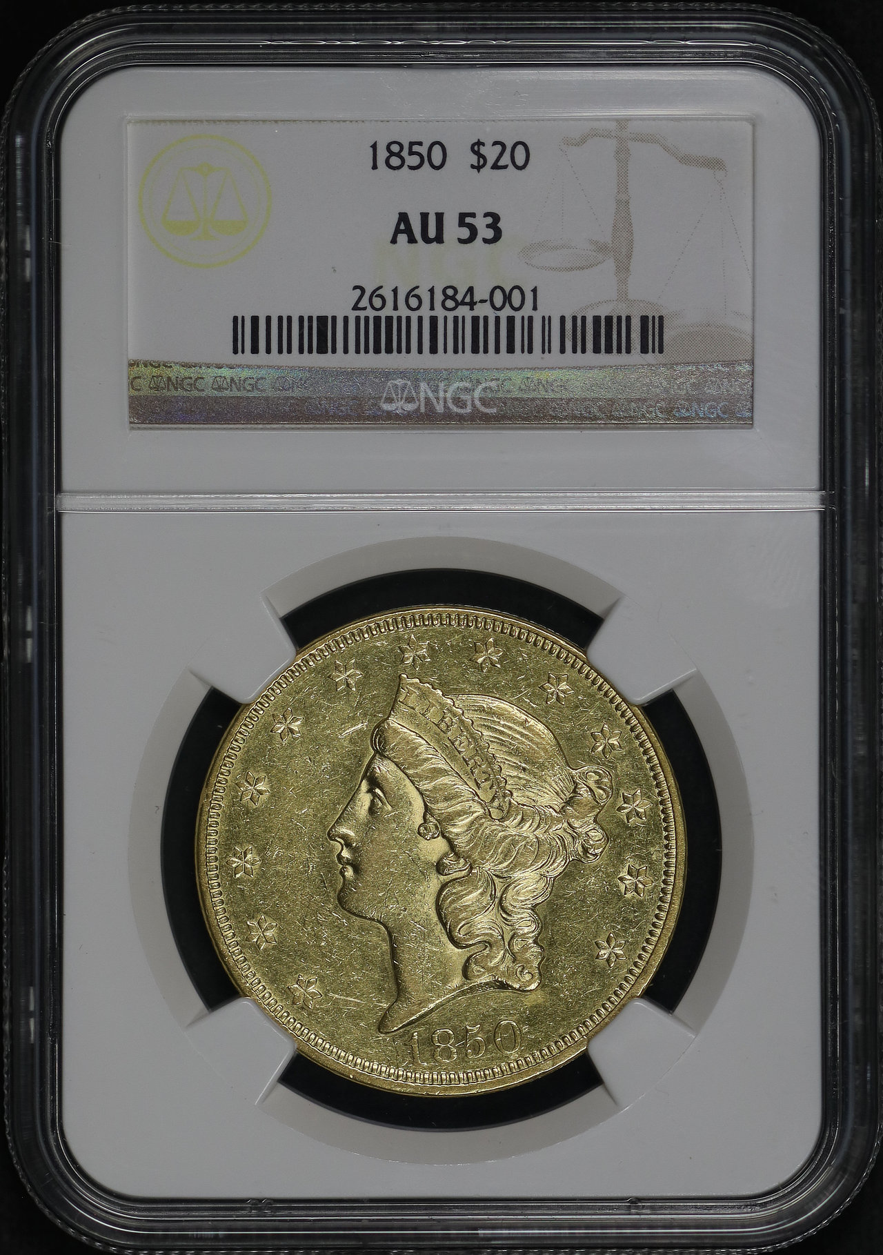 1850 Liberty Head $20 Type 1 NGC AU-53.