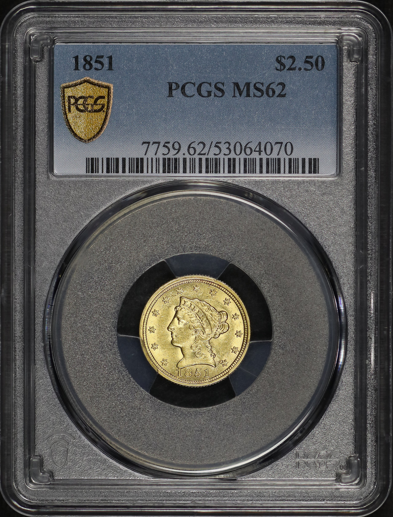 1851 Liberty Head $2.5 PCGS MS-62 designed by Christian Gobrecht.