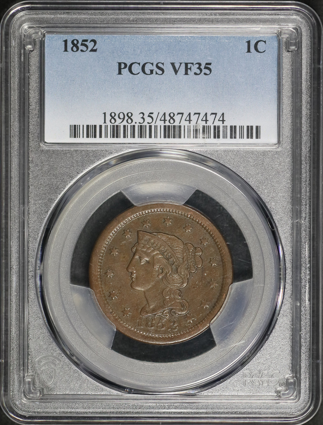 1852 Braided Hair Cent PCGS VF-35 BN designed by Christian Gobrecht.