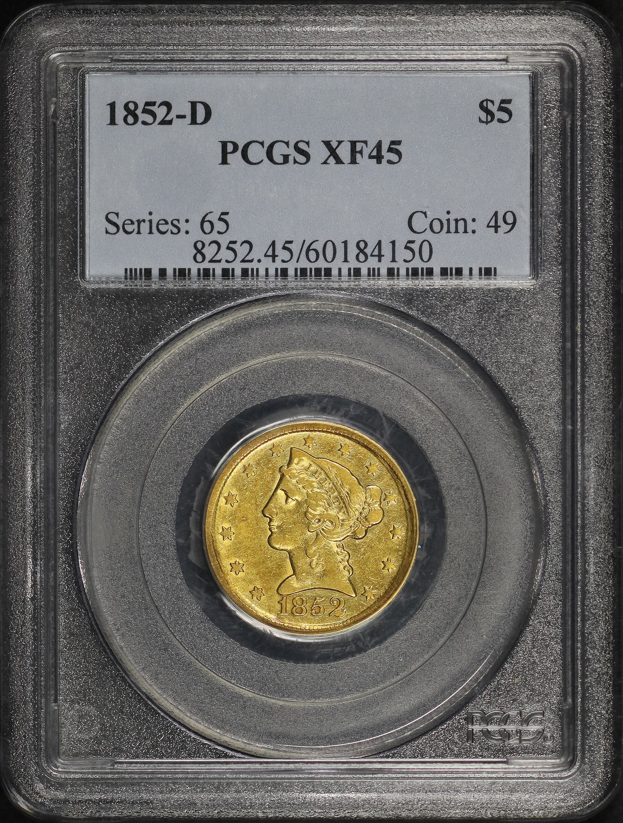 1852-D Liberty Head $5 PCGS XF-45 designed by Christian Gobrecht.