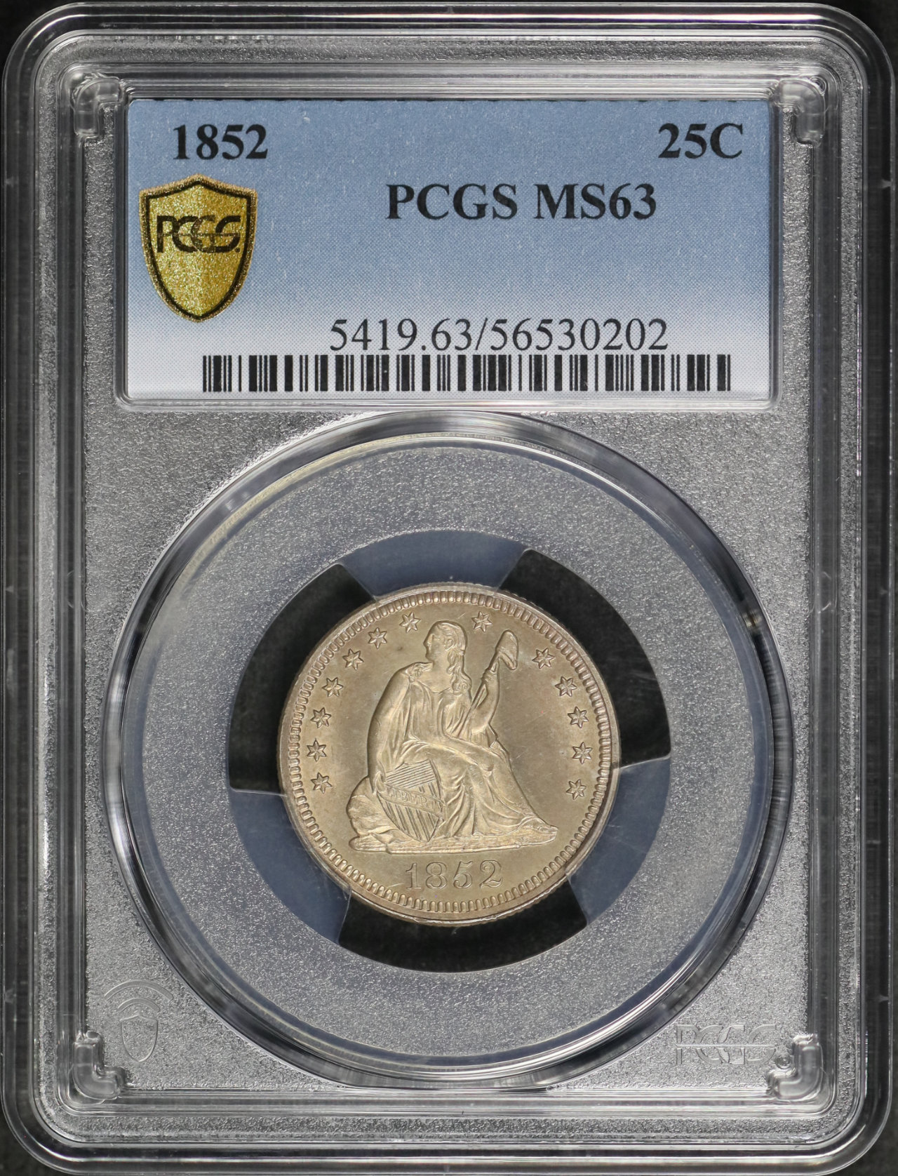 1852 Liberty Seated Quarter PCGS MS-63 designed by Robert Ball Hughes and Christian Gobrecht.