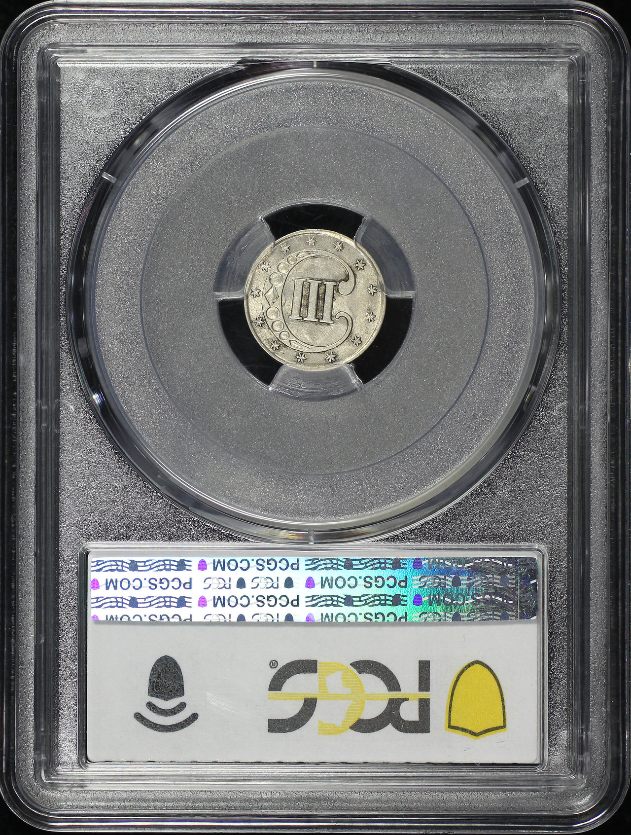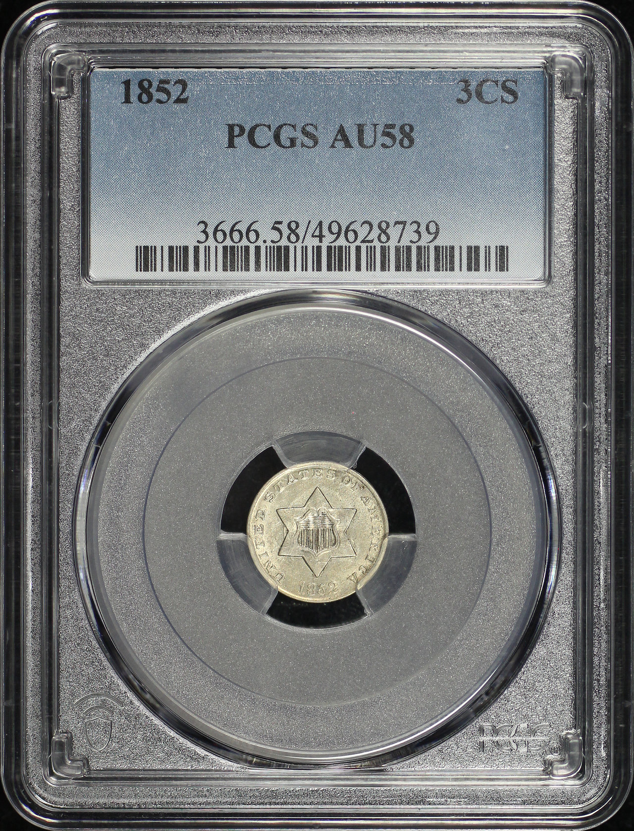 1852 Three Cent Silver PCGS AU-58 designed by James Barton Longacre.