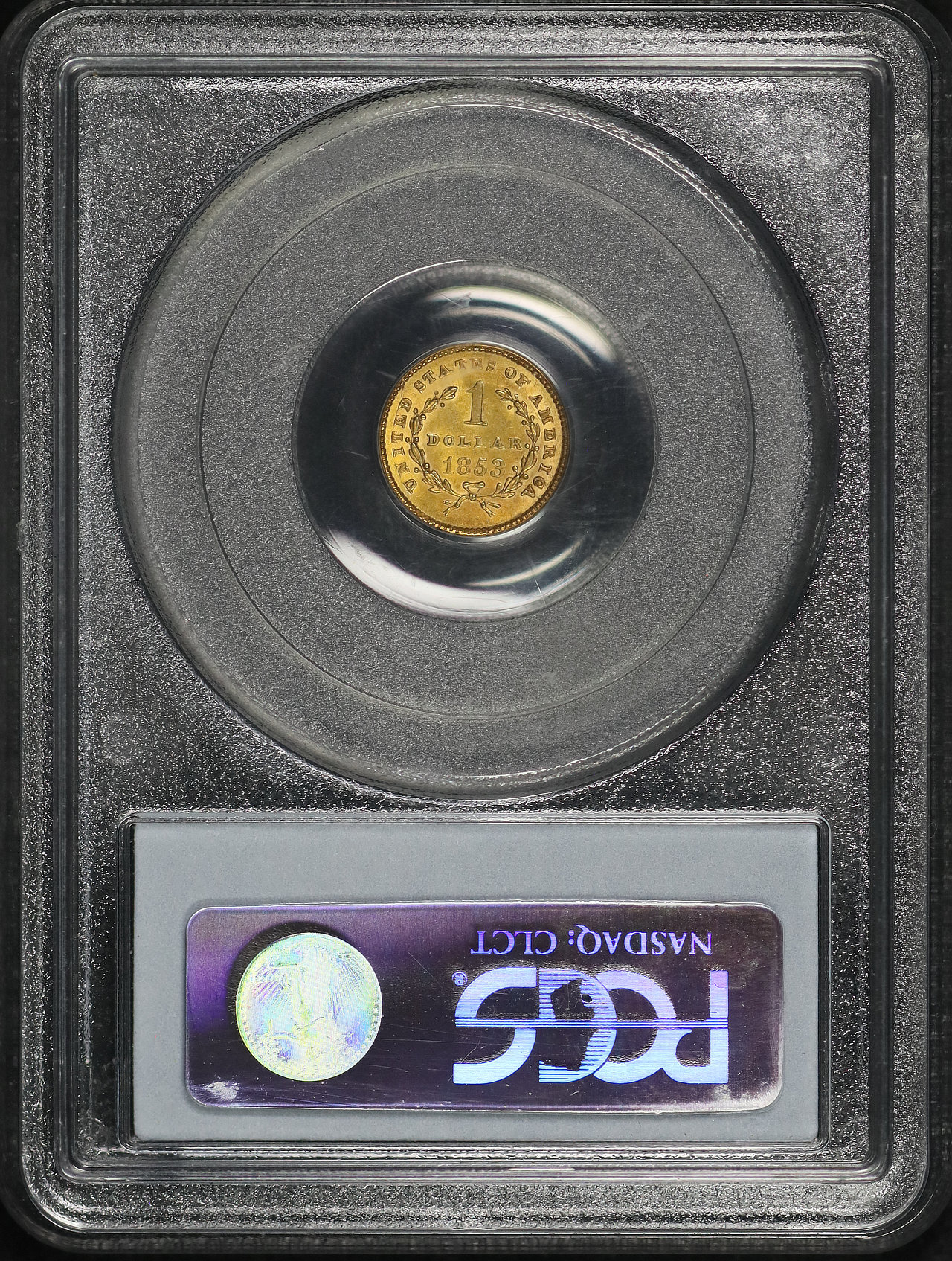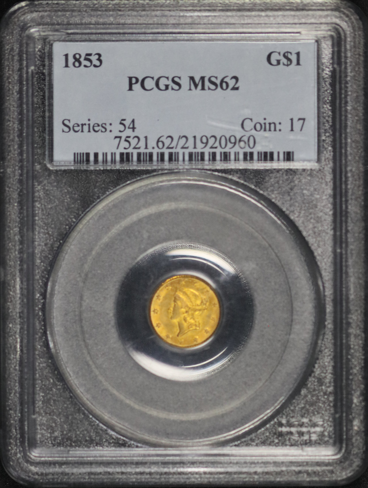 1853 Gold Dollar PCGS MS-62 Type 1 designed by James Barton Longacre.
