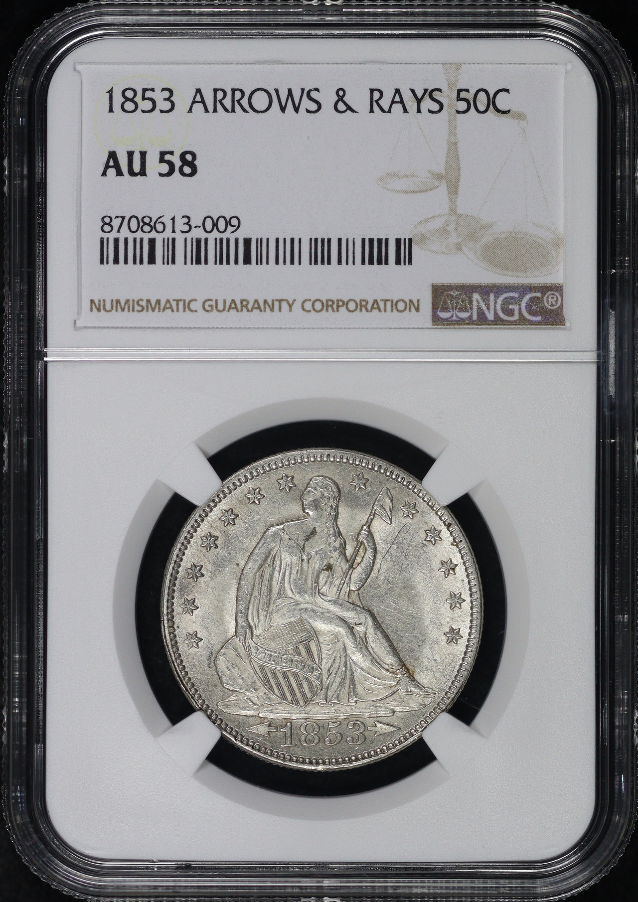 1853 Liberty Seated Half Dollar with Arrows & Rays NGC AU-58.