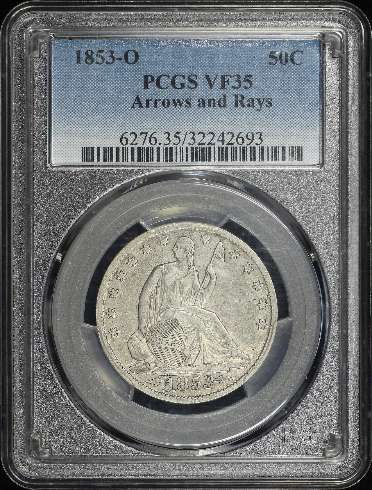 1853-O Liberty Seated Half Dollar Arrows and Rays PCGS VF-35 designed by Thomas Sully and Christian Gobrecht.