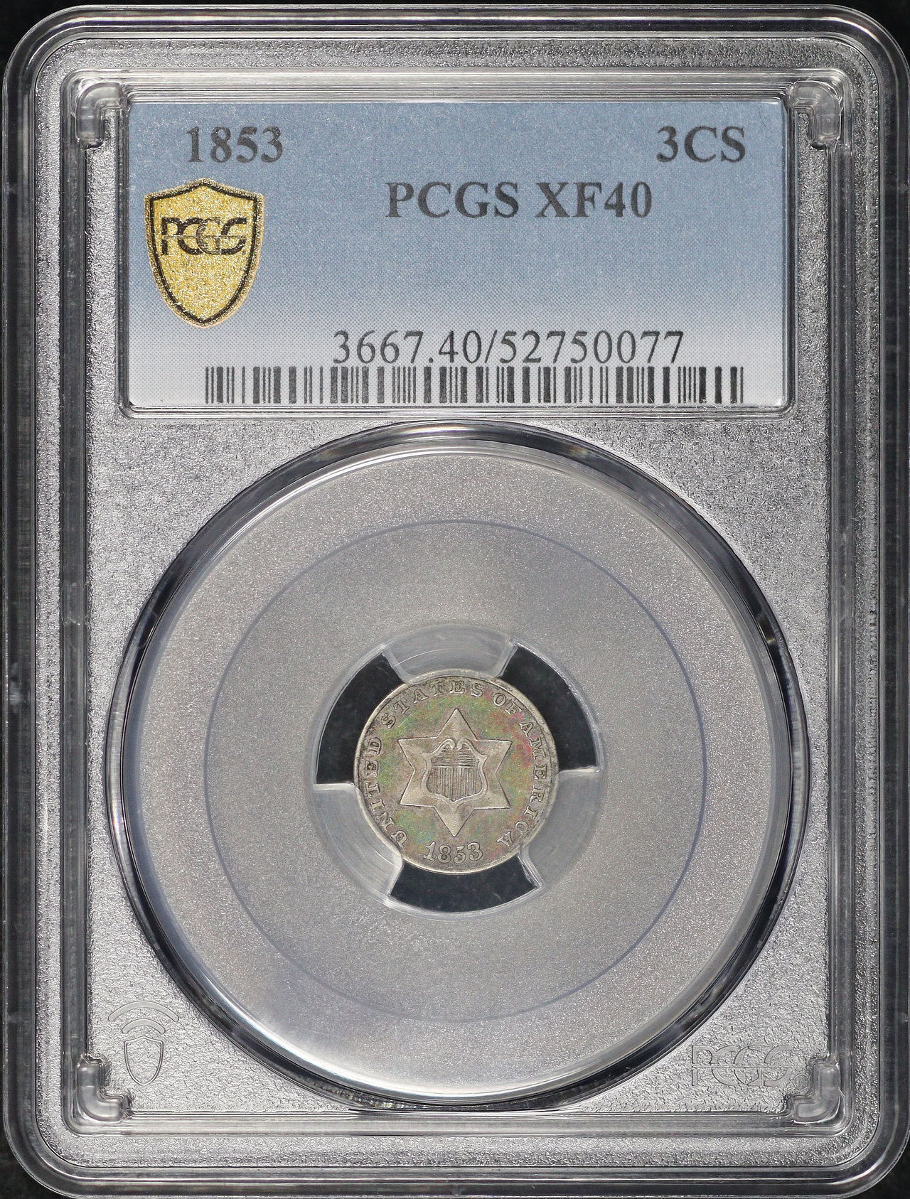 1853 Three Cent Silver PCGS XF-40 – Vivid Green & Violet Hue Toning!