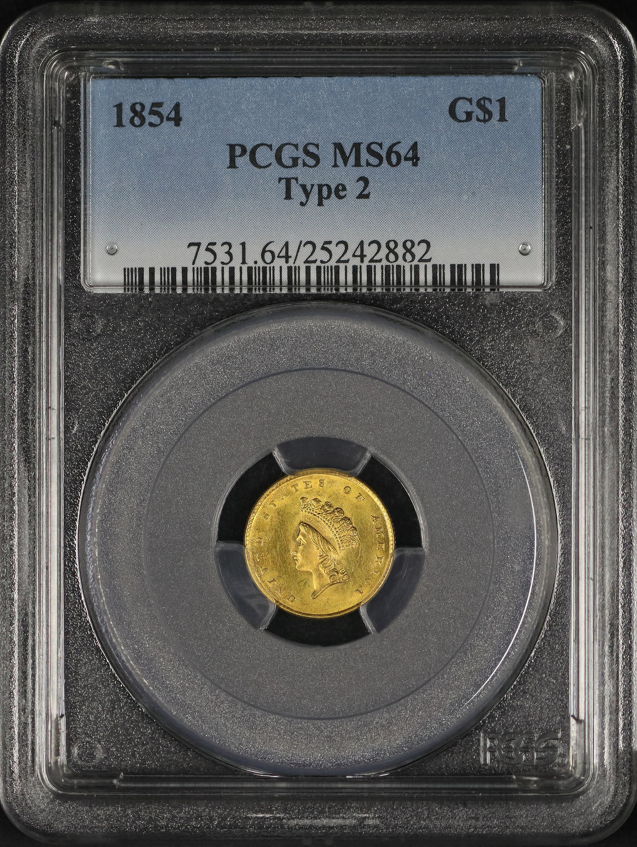 1854 Gold Dollar Type 2 PCGS MS-64 designed by James Barton Longacre.