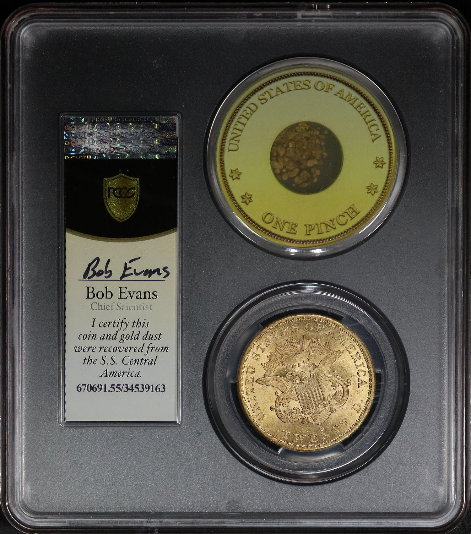 1855-S Liberty Head $20 Bold S PCGS AU-55 S.S. Central America Shipwreck Bob Evans Signature Label with One Pinch of CA Gold Dust
