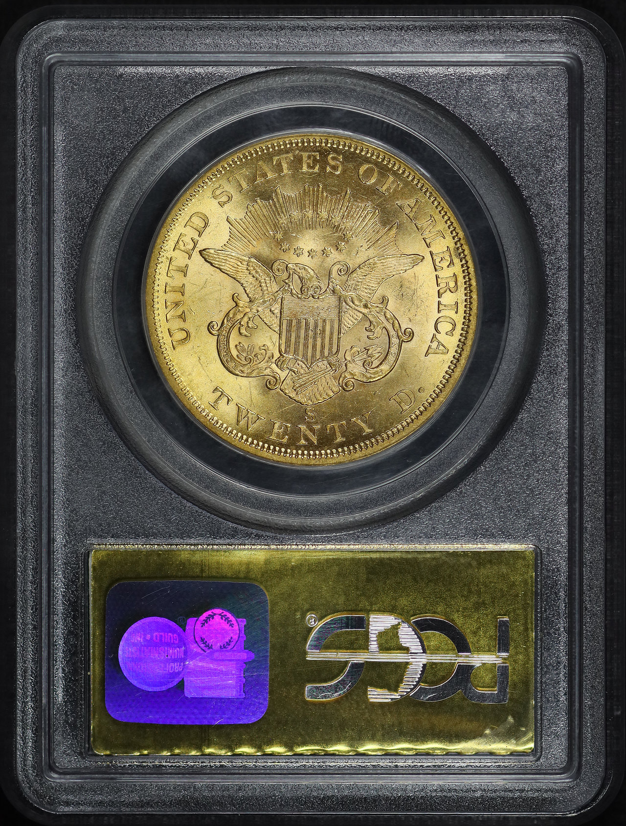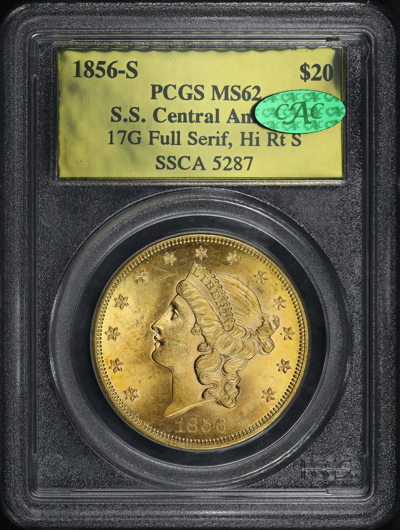 1856-S Liberty Head $20 17G Full Serif Hi Rt S PCGS MS-62 CAC S.S. Central America Shipwreck Gold Foil Label