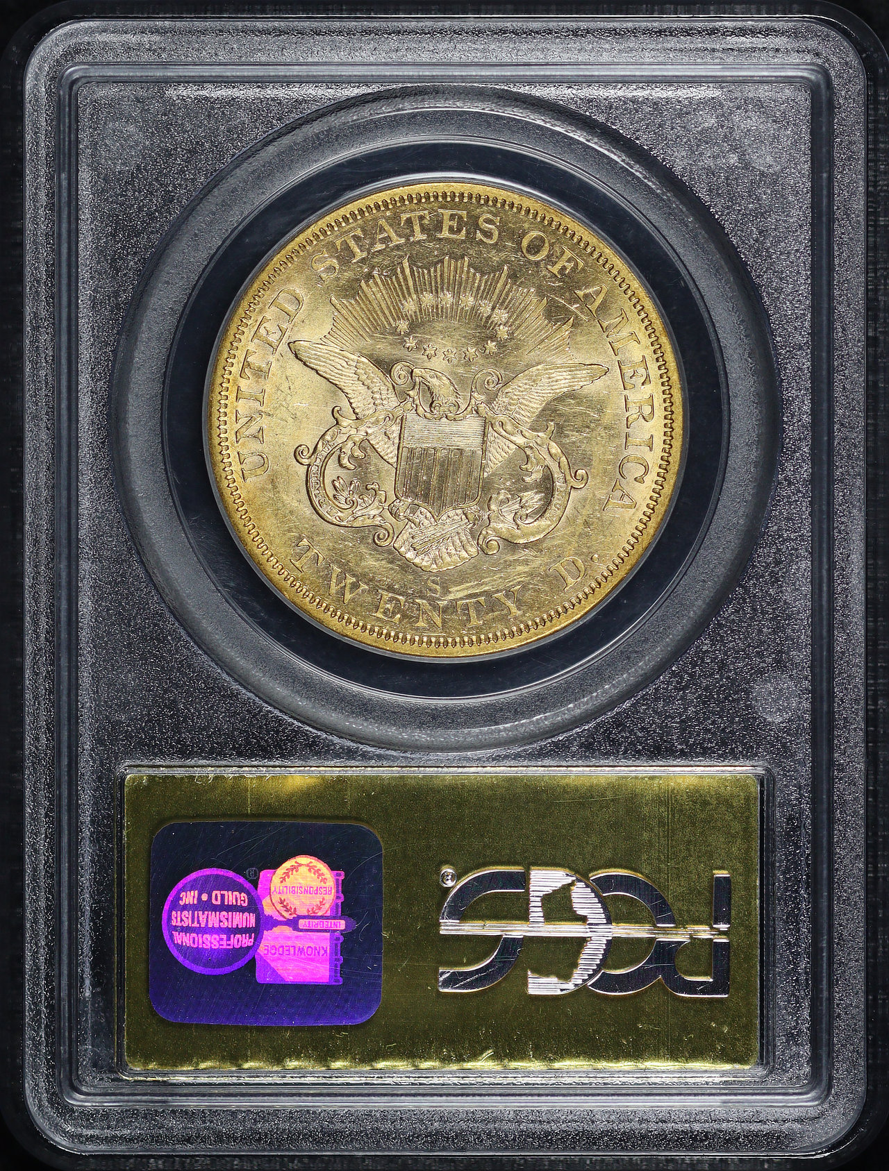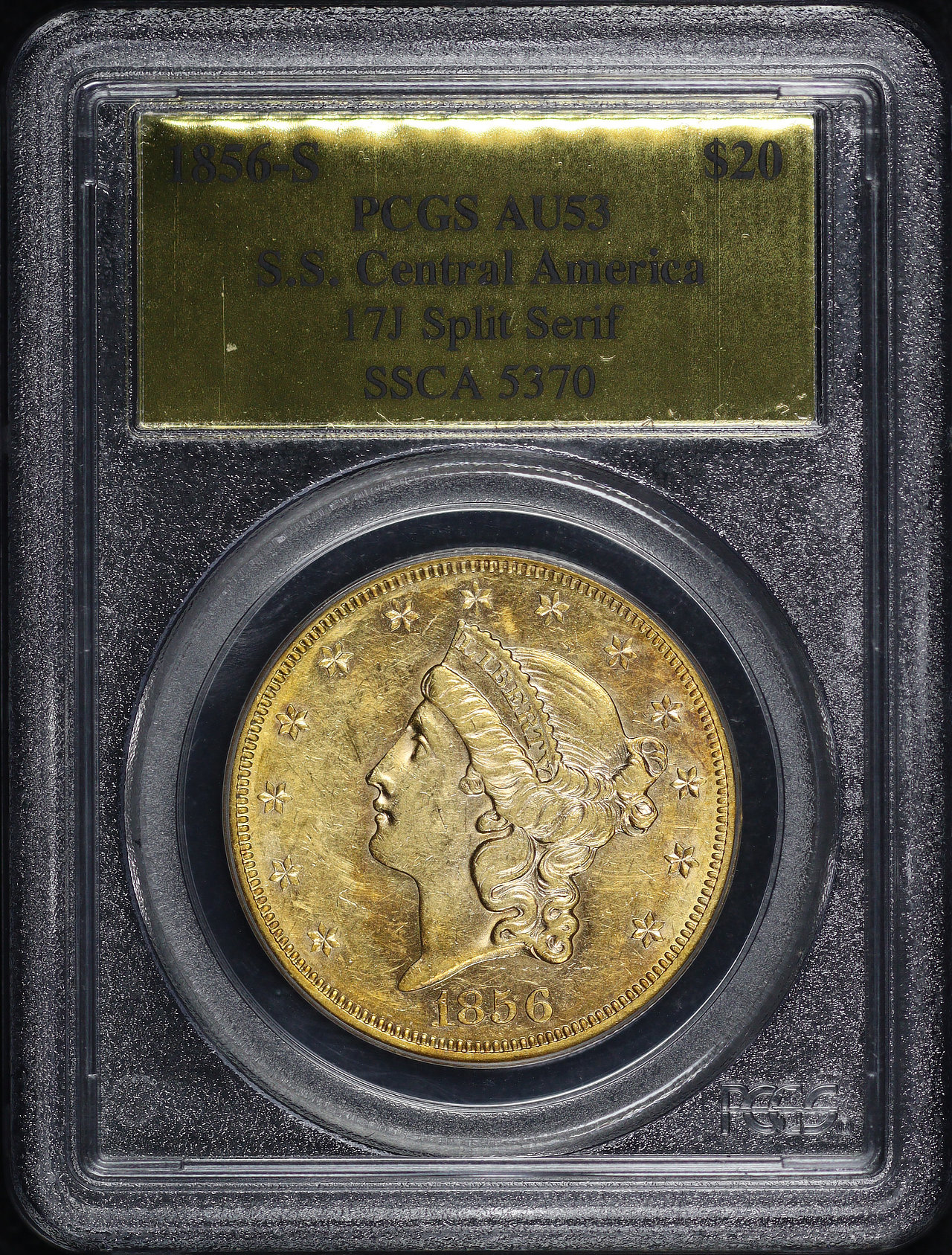 1856-S Liberty Head $20 17J Split Serif PCGS AU-53 S.S. Central America Shipwreck Gold Foil Label.