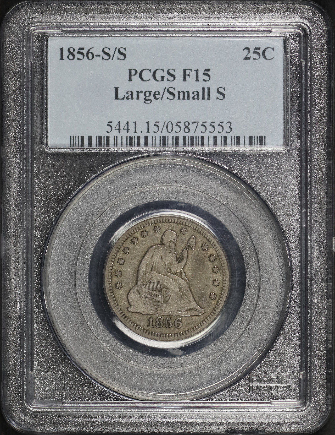 1856-S/S Liberty Seated Quarter PCGS F-15 Large/Small S designed by Robert Ball Hughes and Christian Gobrecht.