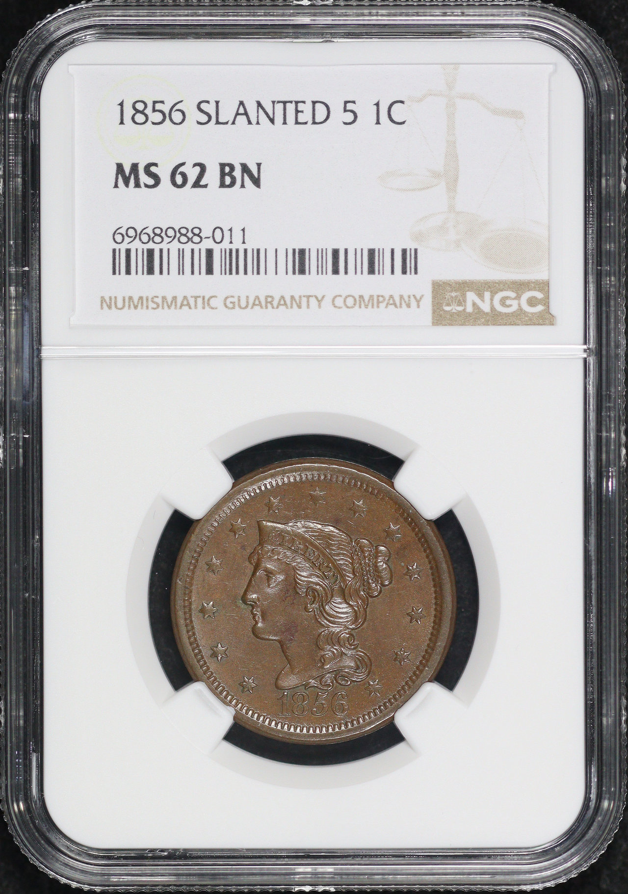 1856 Slanted 5 Braided Hair Cent NGC MS-62 BN