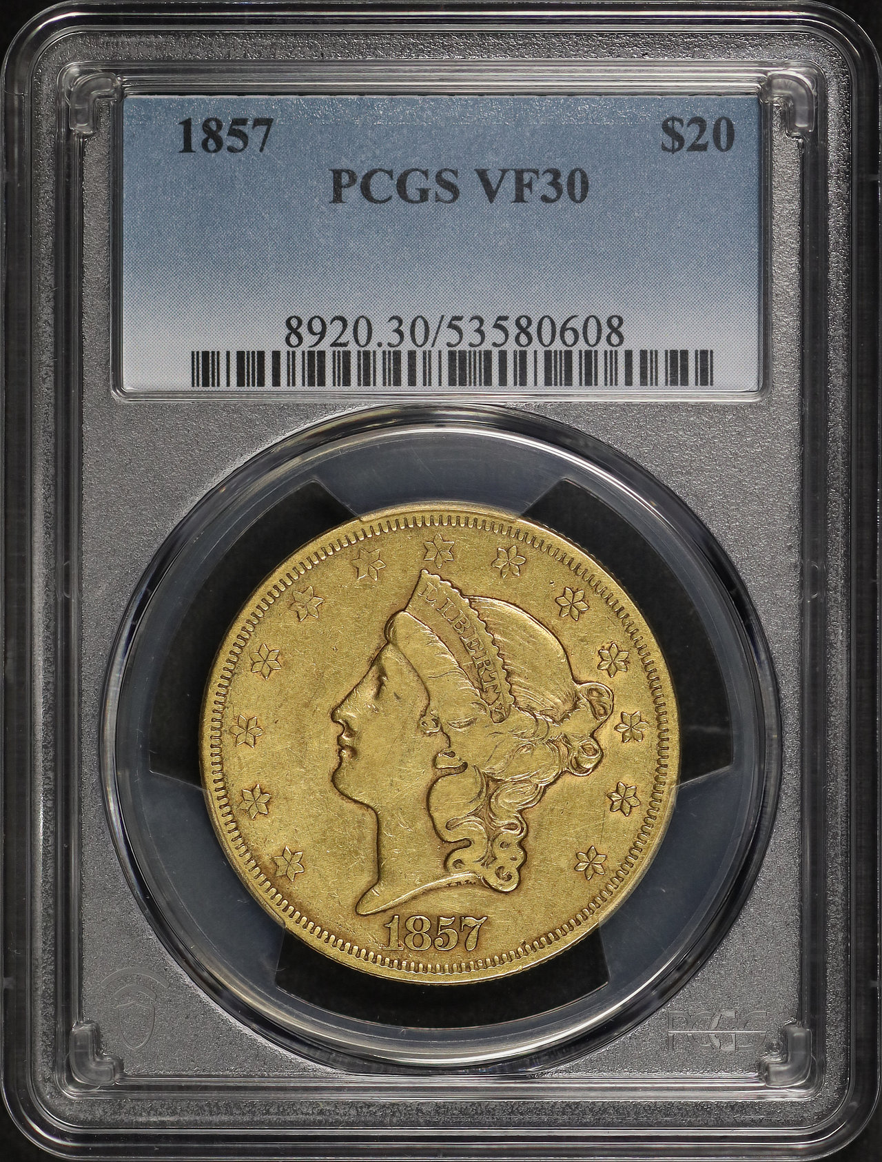 1857 Liberty Head $20 Type 1 PCGS VF-30 designed by James Barton Longacre.
