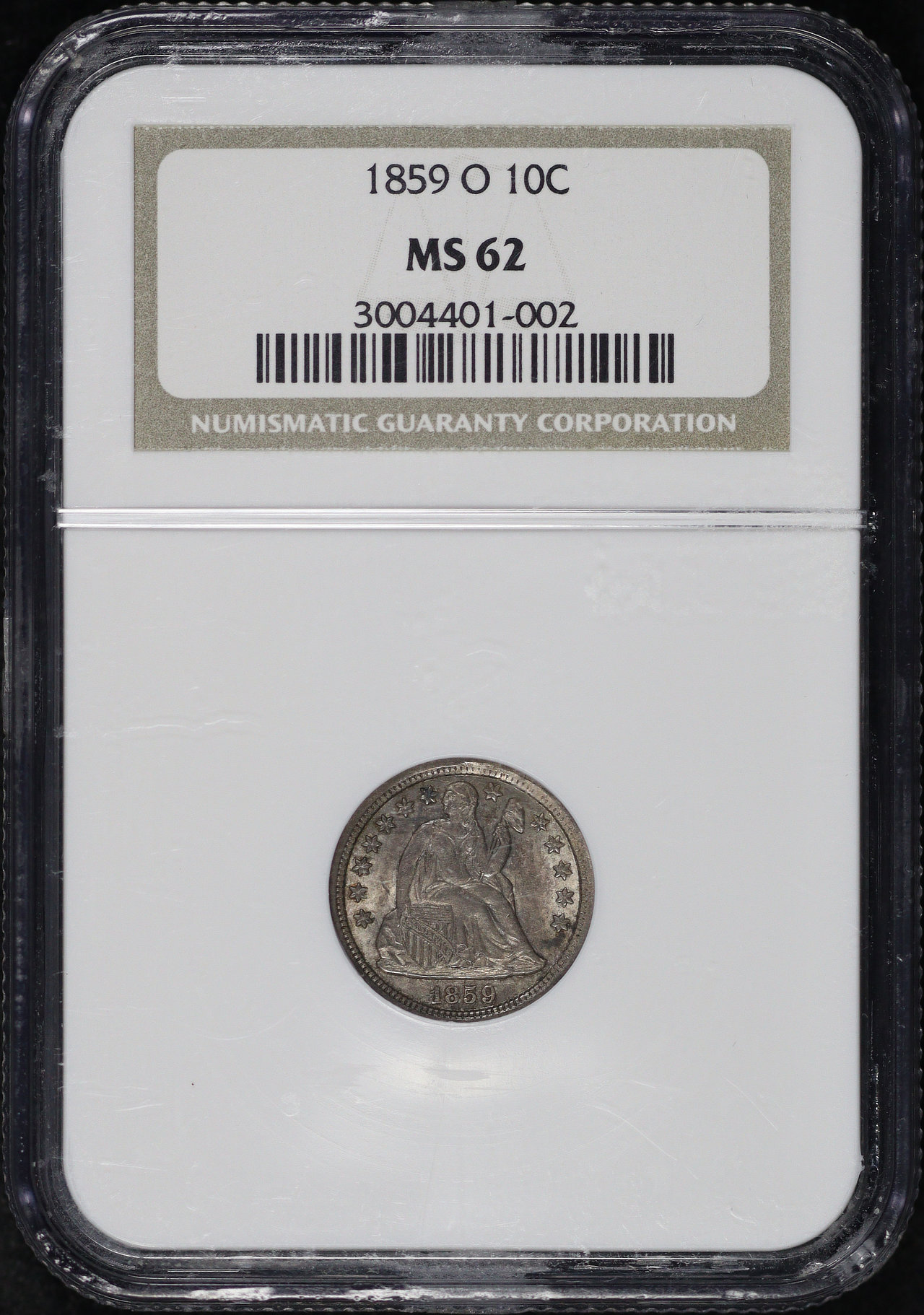 1859-O Liberty Seated Dime NGC MS-62. Both sides display dark blue and crimson hue toning. There are some minor scuffs and scratches on the NGC holder.
