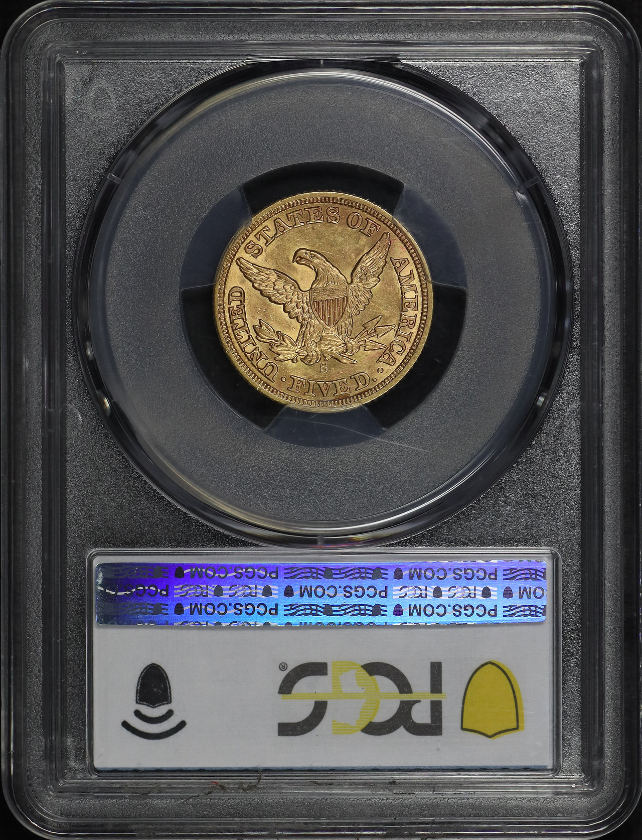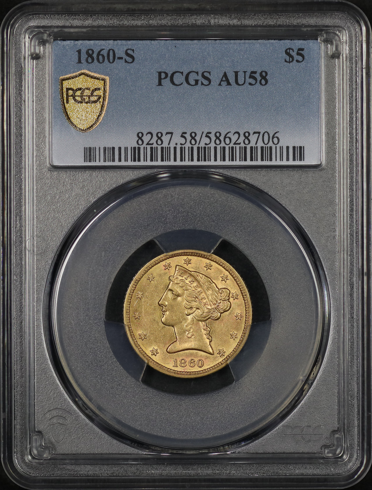1860-S Liberty Head $5 PCGS AU-58 designed by Christian Gobrecht.