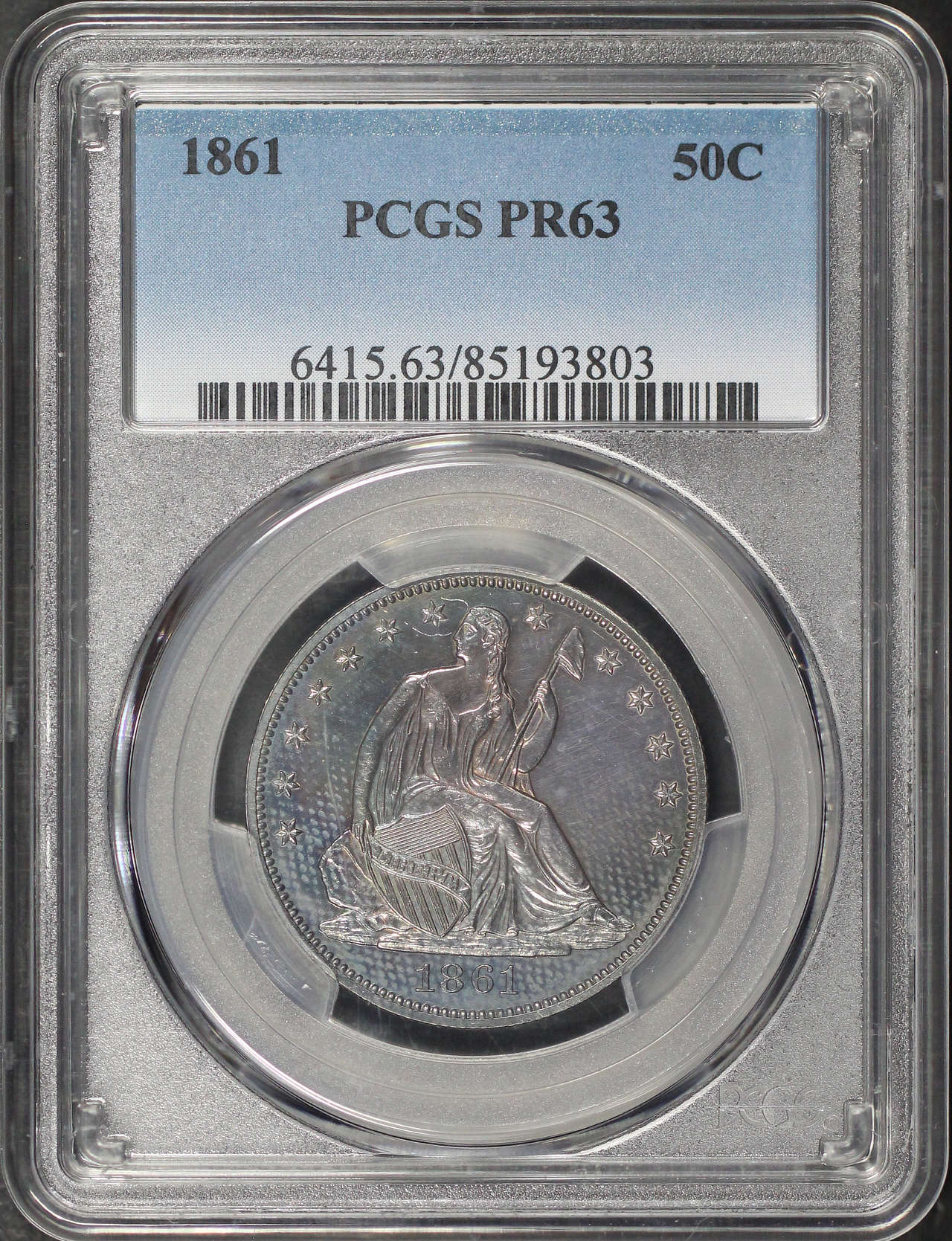 1861 Liberty Seated Half Dollar PCGS PR-63 designed by Thomas Sully and Christian Gobrecht.