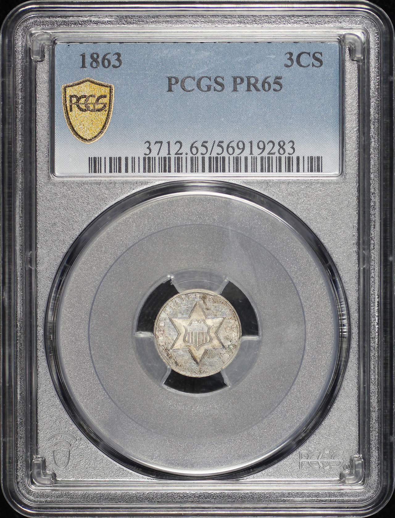 1863 Three Cent Silver PCGS PR-65 designed by James Barton Longacre.