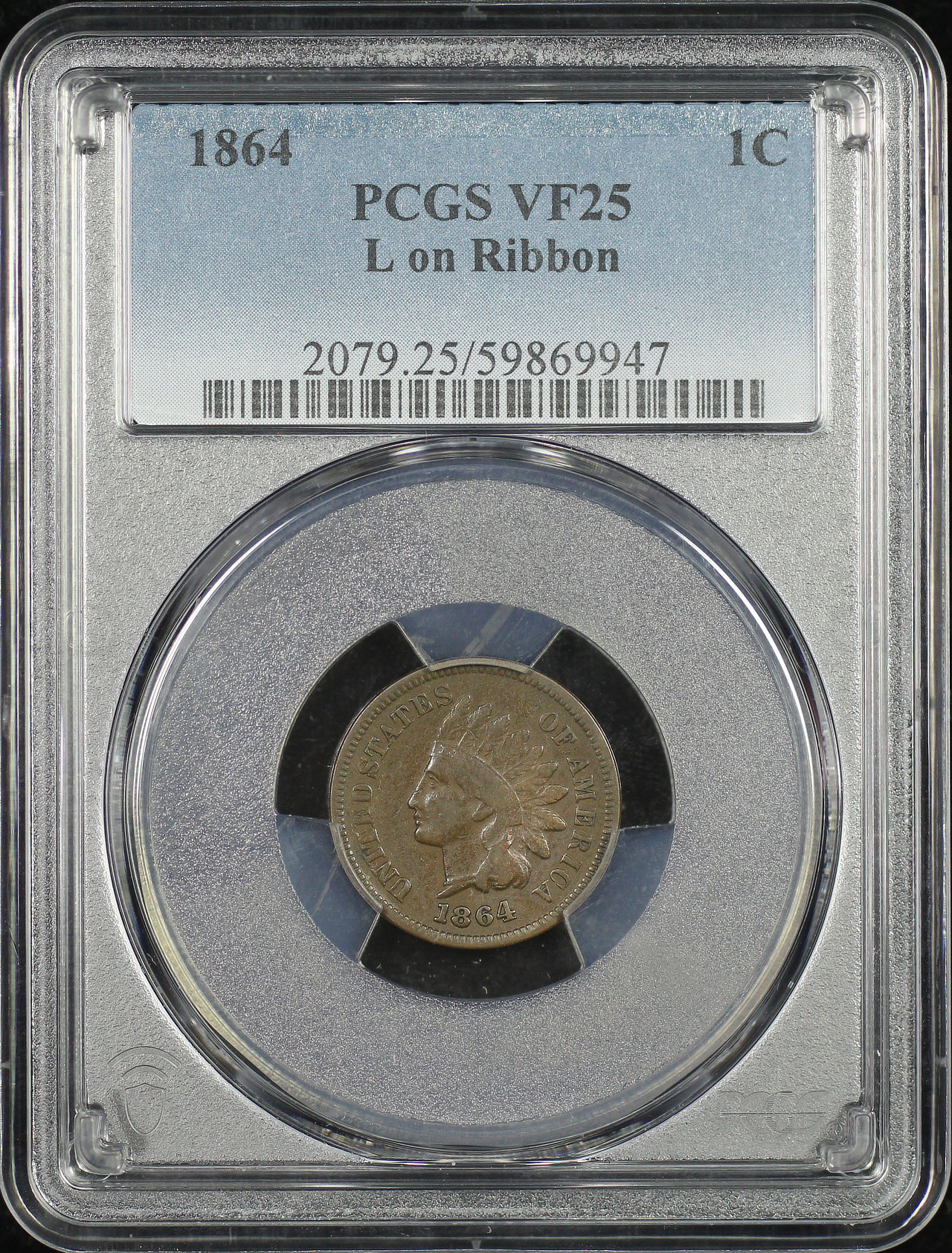 1864 Indian Cent L on Ribbon PCGS VF-25 BN designed by James Barton Longacre.