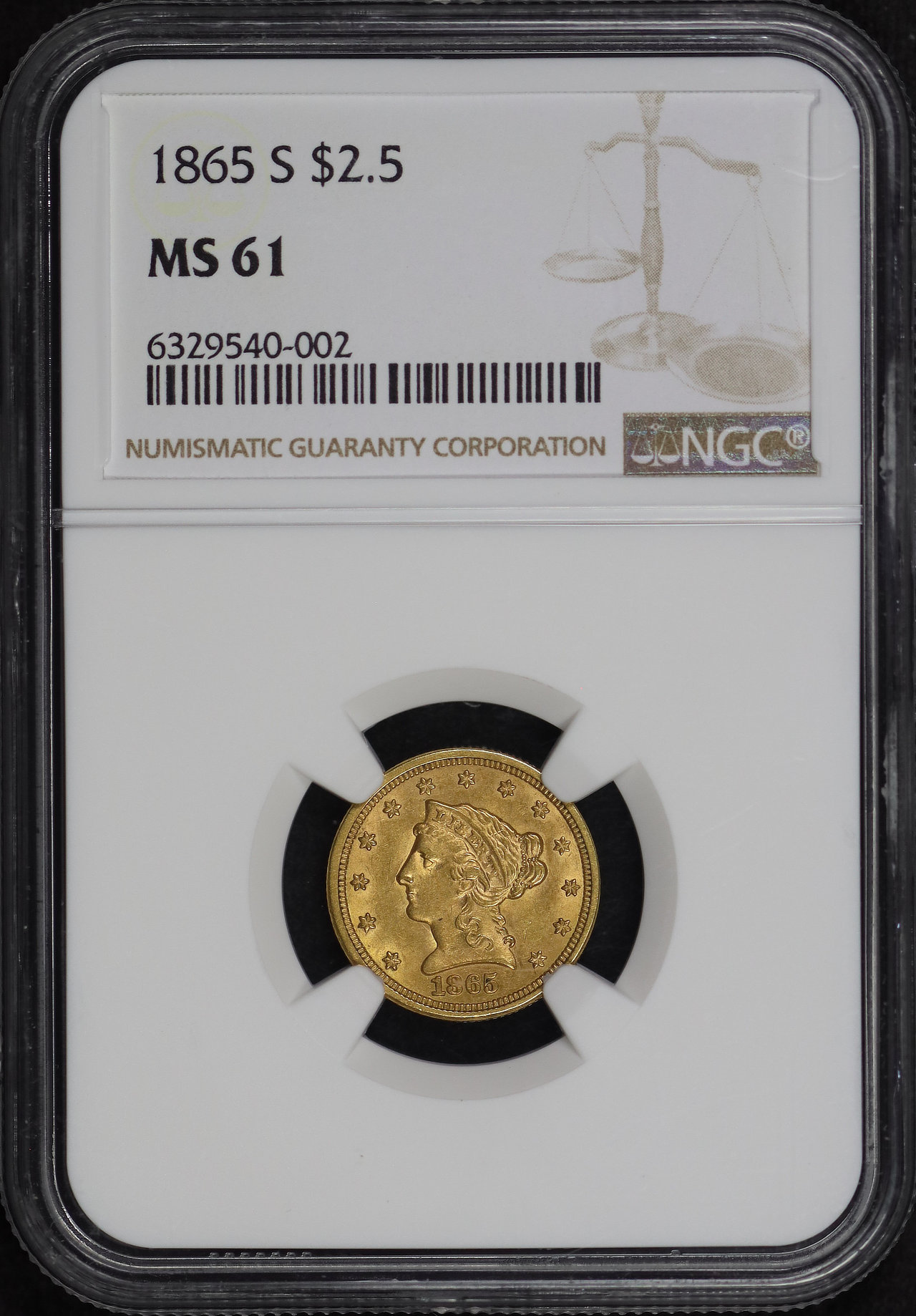 1865-S Liberty Head $2.5 NGC MS-61.