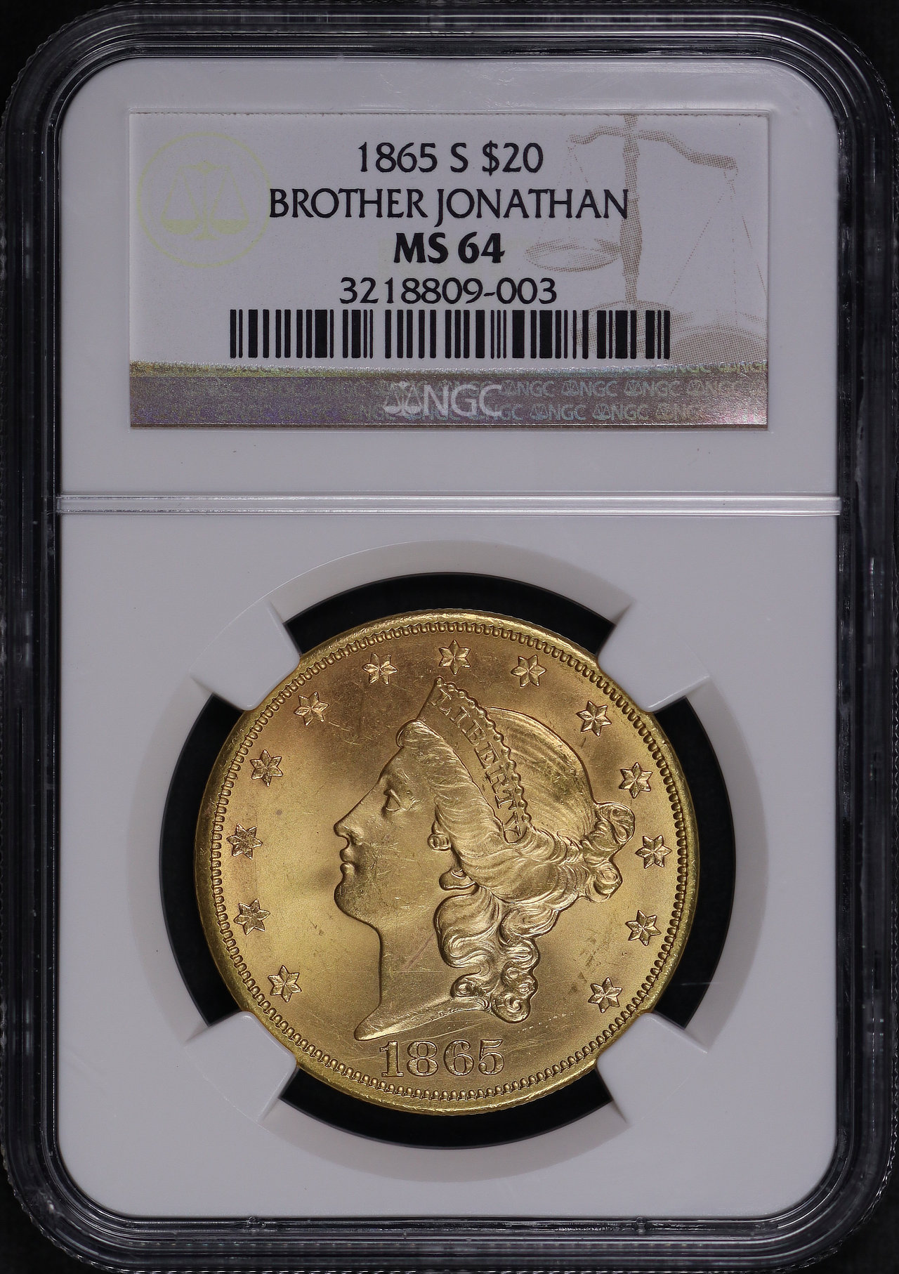 1865-S Liberty Head $20 Type 1 NGC MS-64 Brother Jonathan