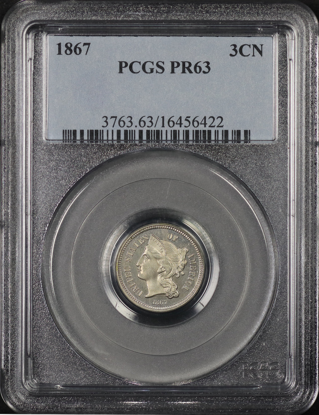 1867 Three Cent Nickel PCGS PR-63 designed by James Barton Longacre.