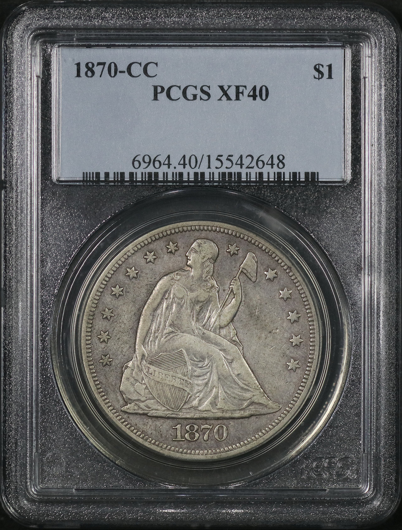 1870-CC Liberty Seated Dollar PCGS XF-40 designed by Christian Gobrecht.