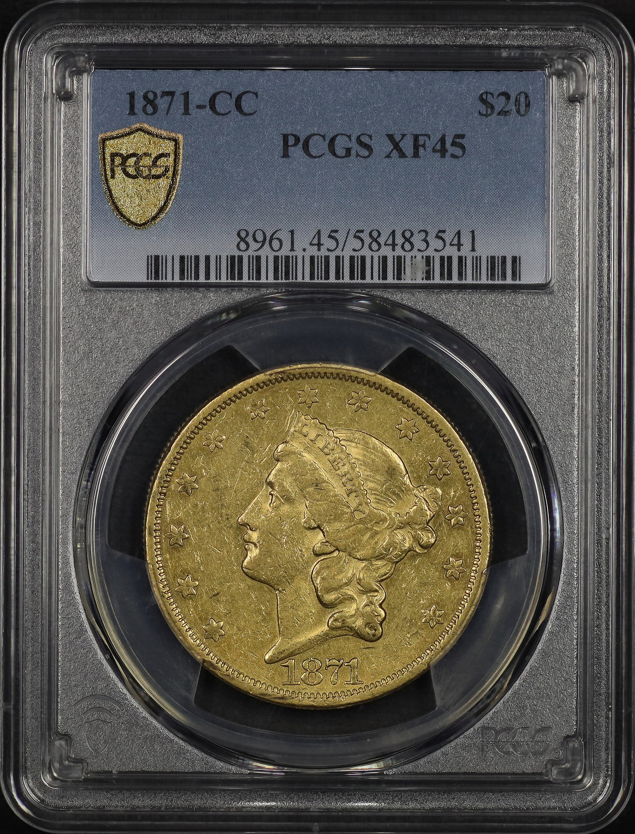 1871-CC Liberty Head $20 Type 2 PCGS XF-45 designed by James Barton Longacre.