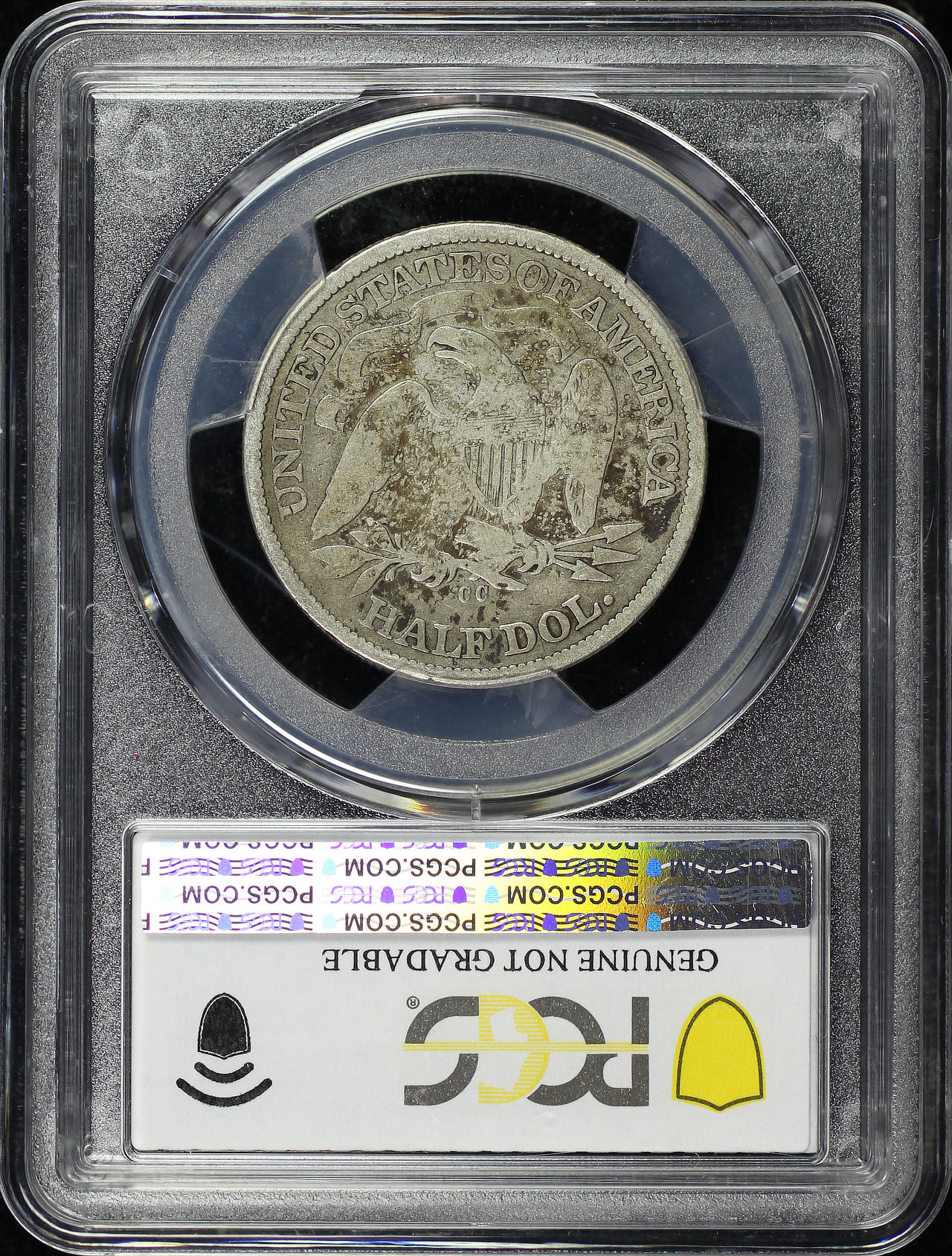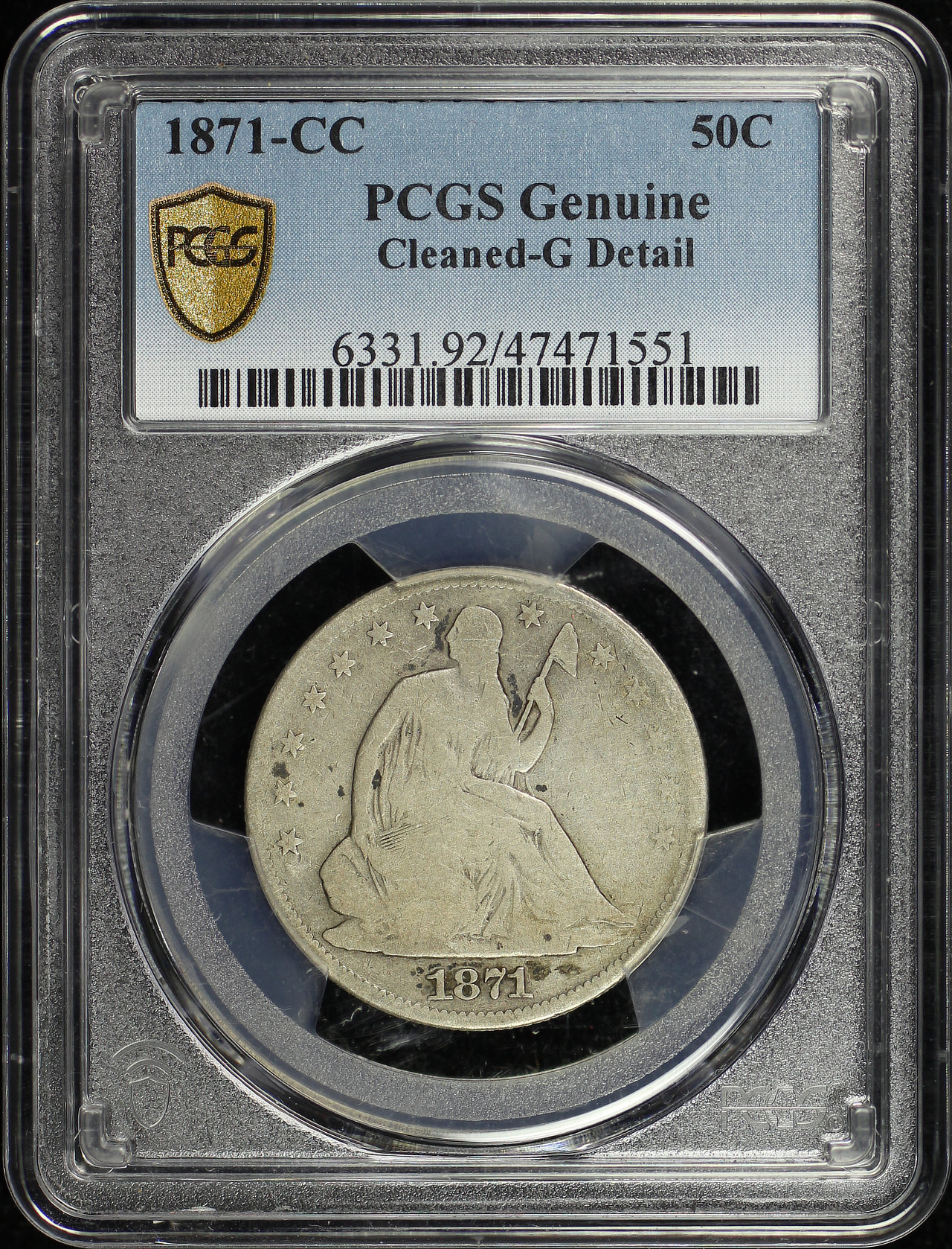 1871-CC Seated Liberty Half Dollar PCGS G Details Cleaned designed by Thomas Sully and Christian Gobrecht. This coin has the given grade as a result of it being improperly cleaned, showing faint hairlines, dark spots, and glossy surfaces.